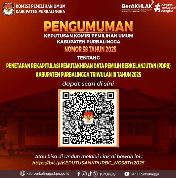 Berikut kami umumkan bahwa KPU Kabupaten Purbalingga telah menggelar Rapat Pleno Terbuka Pemutakhiran Data Pemilih Berkelanjutan (PDPB) Triwulan Ketiga Tahun 2025 pada Kamis, (2/10/05) di Aula KPU Kabupaten Purbalingga. Adapun hasil rekapitulasi PDPB tersebut dapat diakses melalui Keputusan Komisi Pemilihan Umum Kabupaten Purbalingga Nomor 38 Tahun 2025 tentang Penetapan Rekapitulasi Pemutakhiran Data Pemilih Berkelanjutan Kabupaten Purbalingga Triwulan Ketiga Tahun 2025 melalui link berikut SK Nomor 38 Tahun 2025 UNDUH