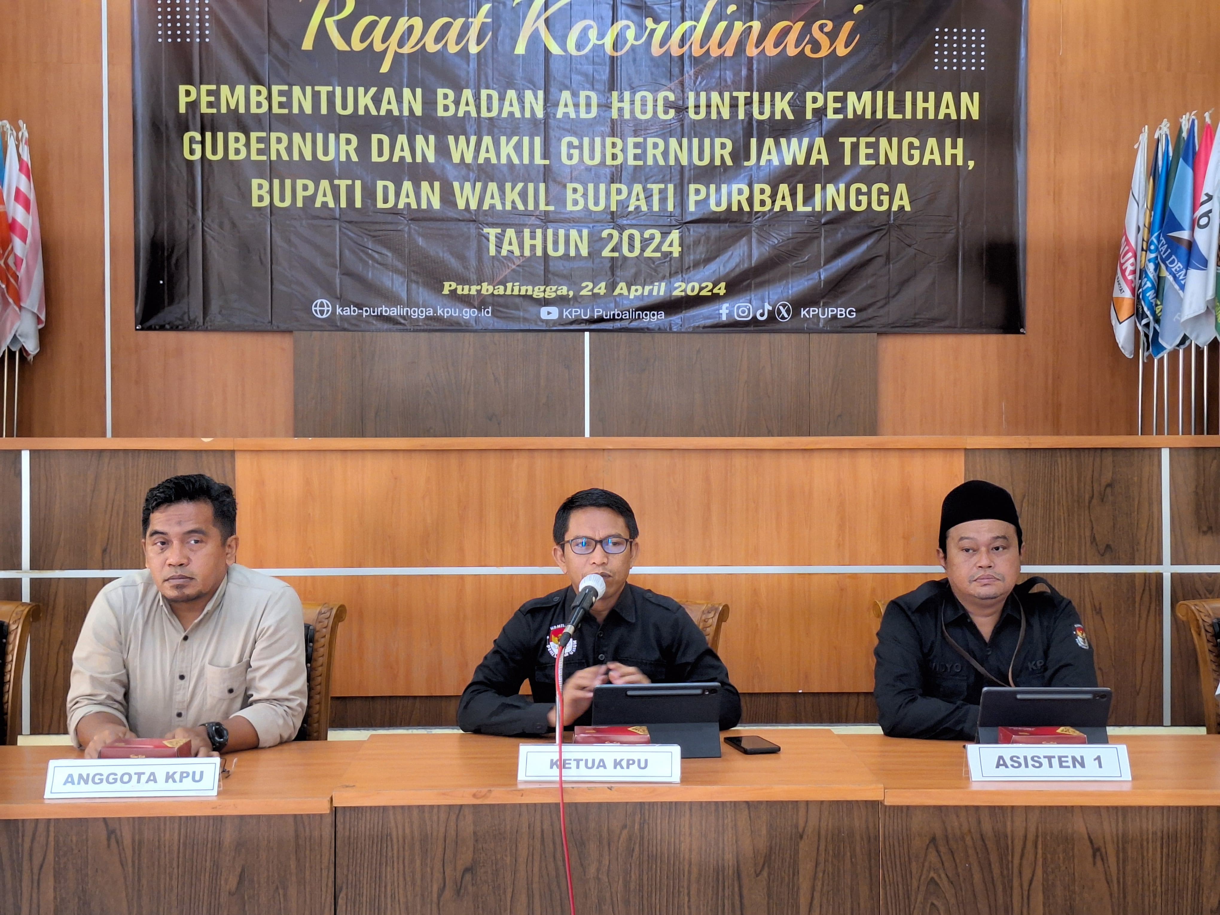 PURBALINGGA -- KPU Kabupaten Purbalingga menyelenggarakan Rapat Koordinasi Pembentukan Badan Adhoc untuk Pemilihan Gubernur dan Wakil Gubernur Jawa Tengah, Bupati dan Wakil Bupati Purbalingga Tahun 2024 pada Rabu, 24 April 2024 bertempat di Aula KPU Kabupaten Purbalingga. Hadir dalam kegiatan tersebut Bawaslu Kabupaten Purbalingga, dinas dan instansi terkait serta Camat se Kabupaten Purbalingga.