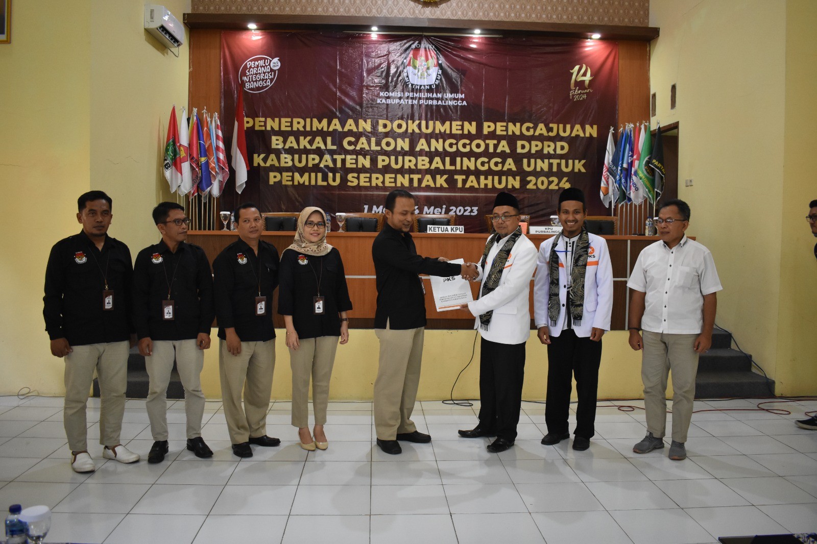 PURBALINGGA -- Komisi Pemilihan Umum Kabupaten Purbalingga untuk pertama kalinya menerima dokumen pengajuan bakal calon (bacalon) anggota DPRD Kabupaten Purbalingga dari partai politik (parpol) peserta Pemilu 2024 di hari ke 10 (Rabu, 10 Mei 2023). Bertempat di Aula Kantor KPU dan disaksikan oleh Bawaslu Kabupaten Purbalingga, KPU menerima dua parpol yaitu Dewan Perwakilan Daerah (DPD) Partai Ummat dan Partai Keadilan Sejahtera (PKS) Kabupaten Purbalingga.