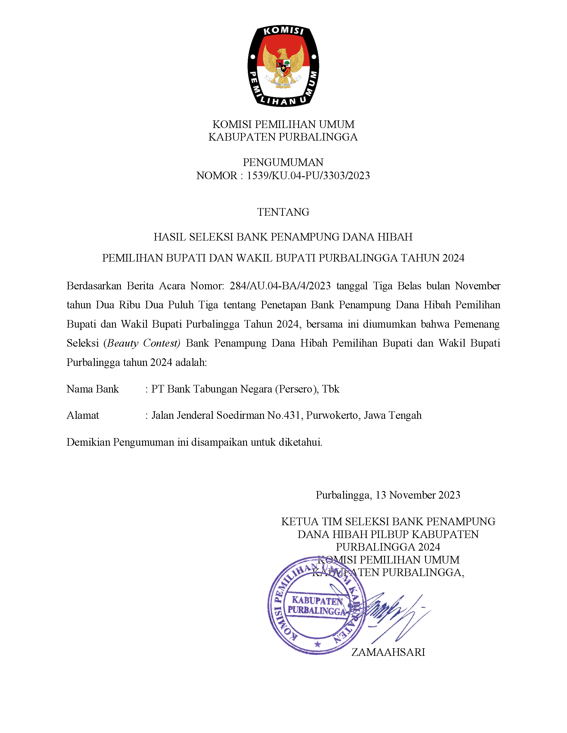 Pengumuman Hasil Seleksi Bank Penampung Dana Hibah Pemilihan Bupati dan Wakil Bupati Purbalingga Tahun 2024 dapat diunduh disini.