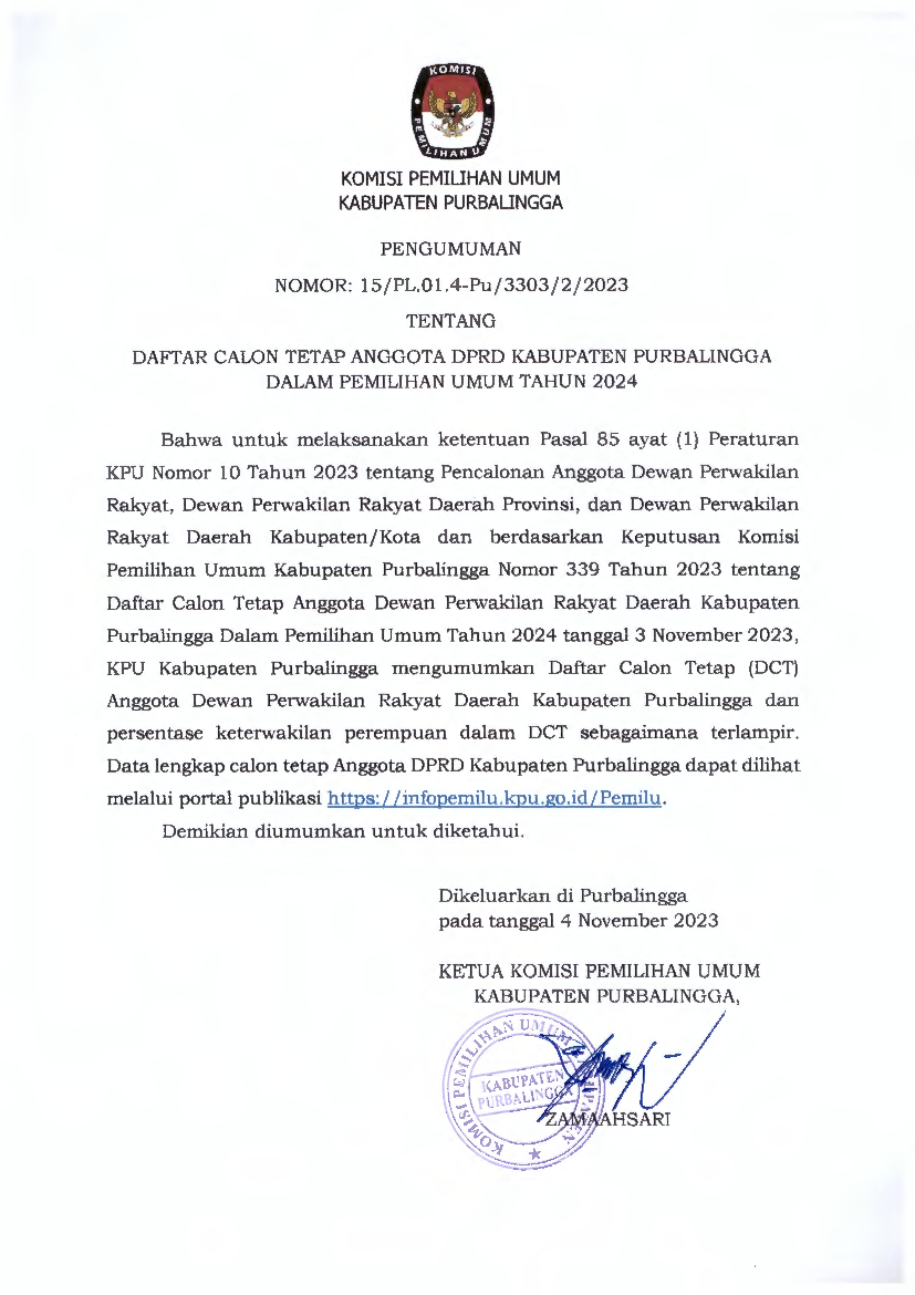 Pengumuman Daftar Calon Tetap Anggota DPRD Kabupaten Purbalingga Dalam Pemilu Tahun 2024