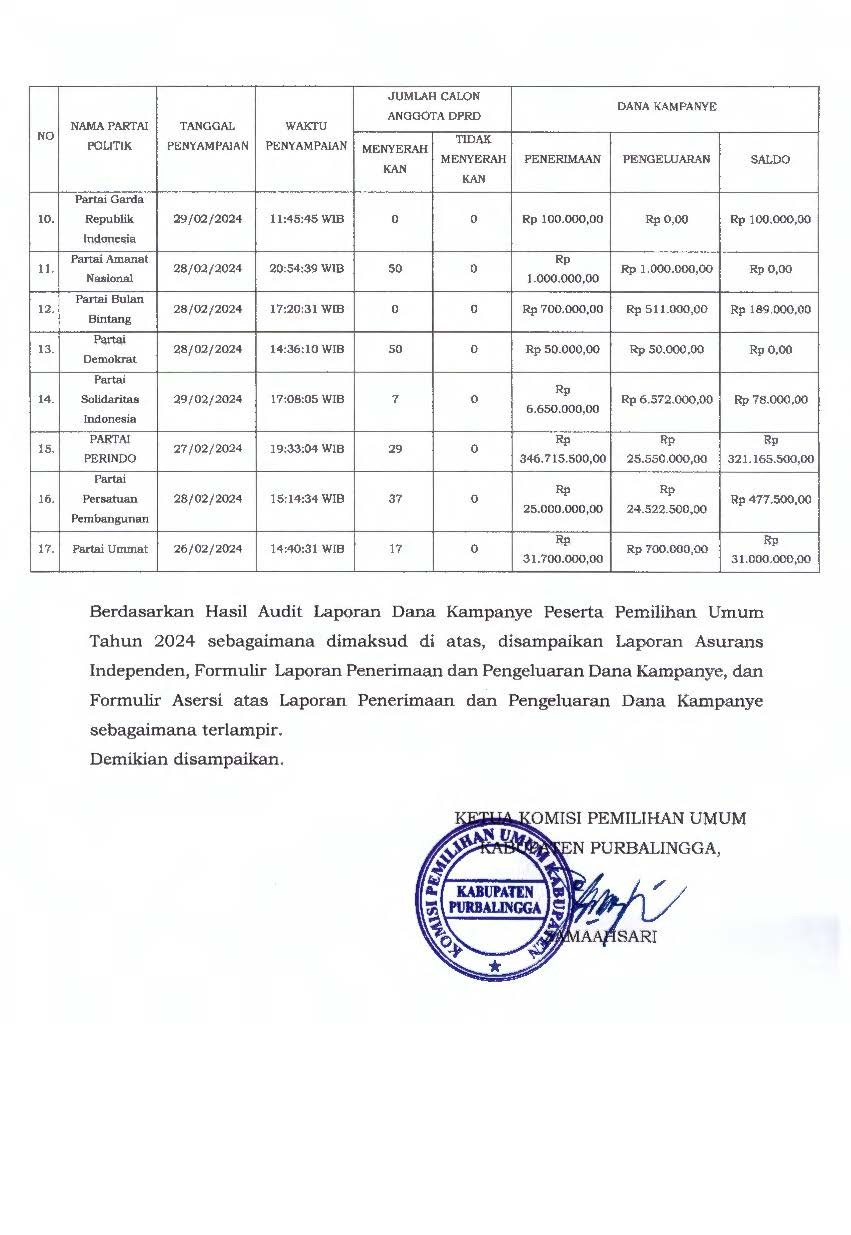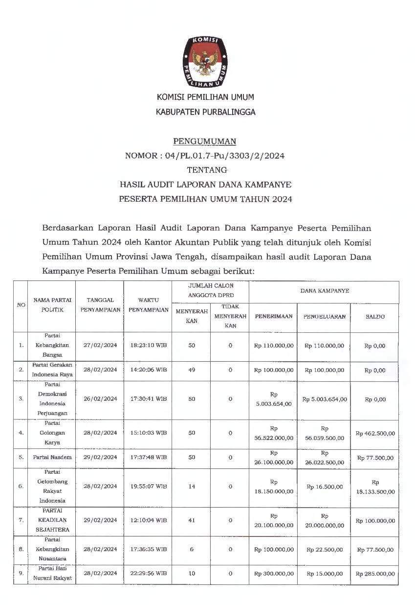 Pengumuman Hasil Audit Dana Kampanye Peserta Pemilu 2024