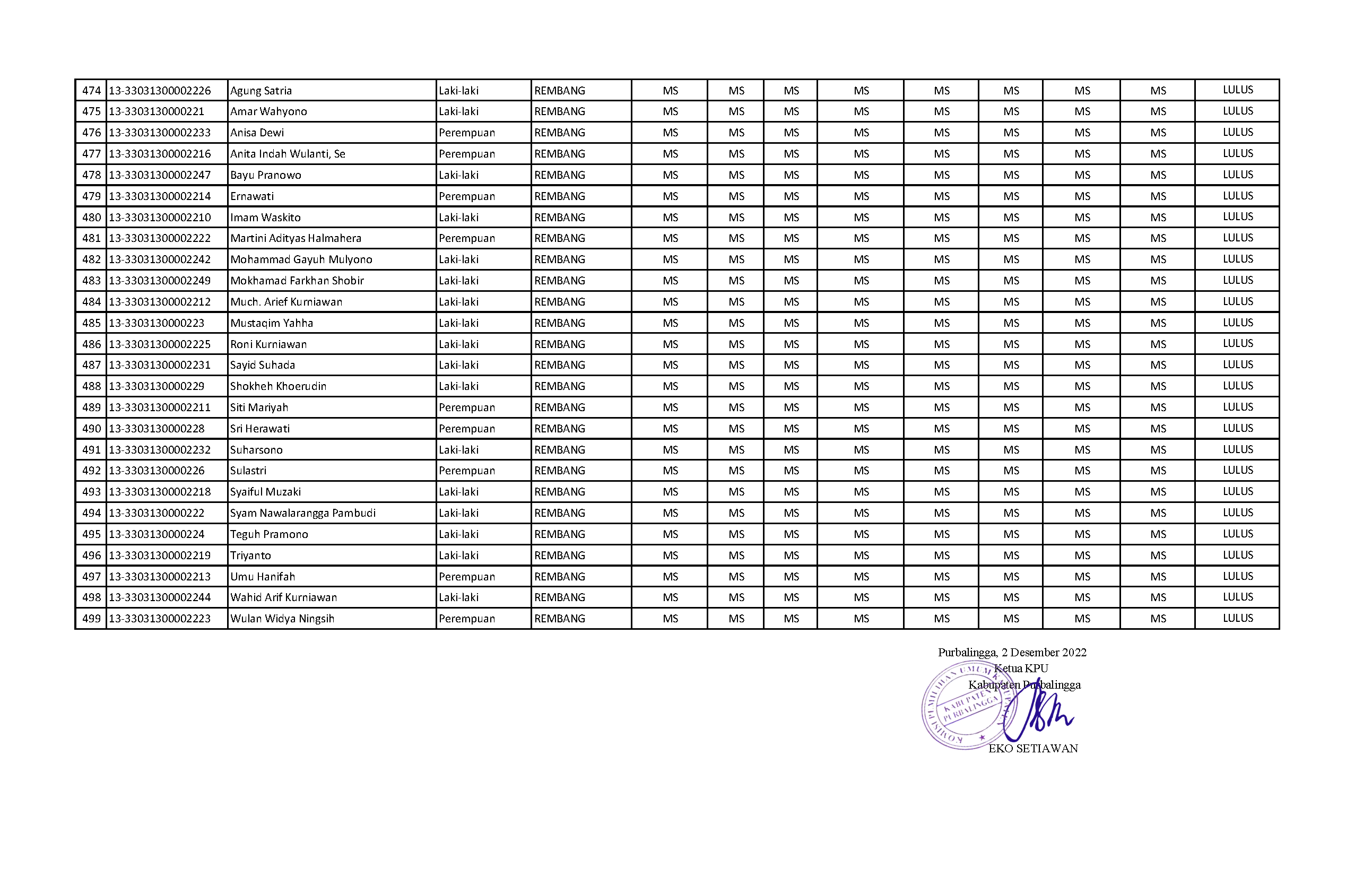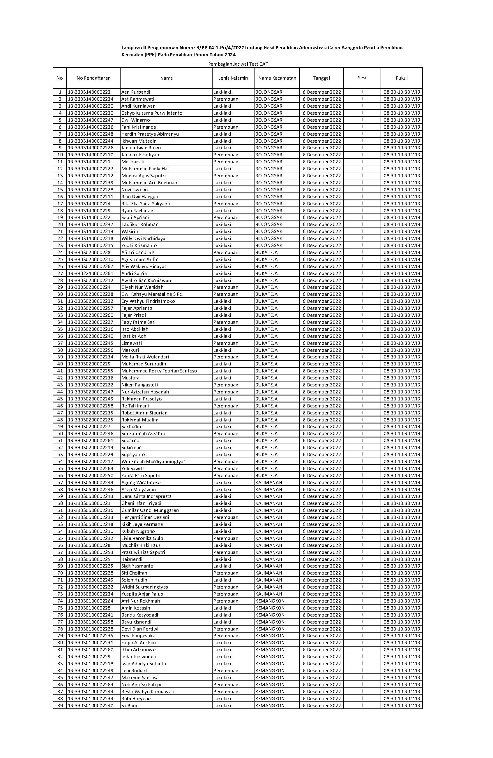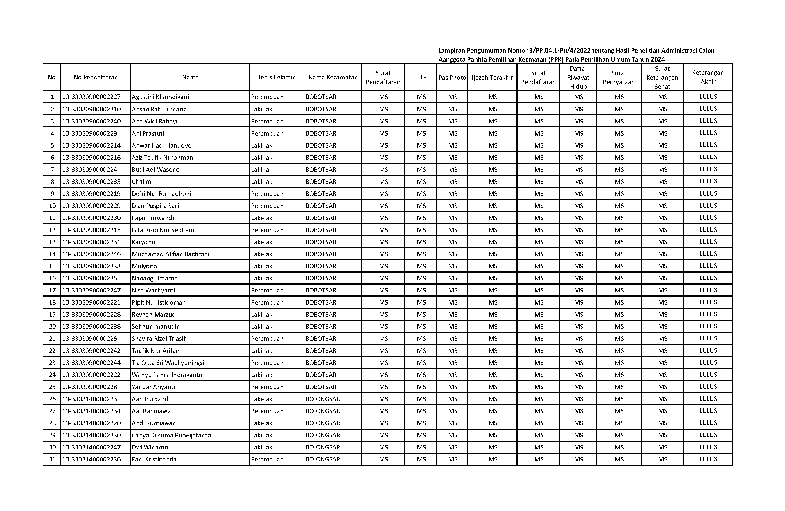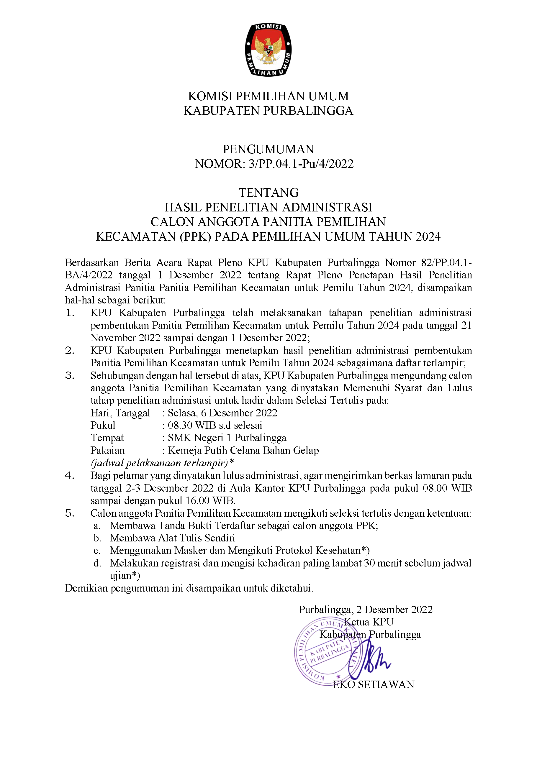 Pengumuman Hasil Penelitian Administrasi Calon Anggota PPK pada Pemilu Tahun 2024