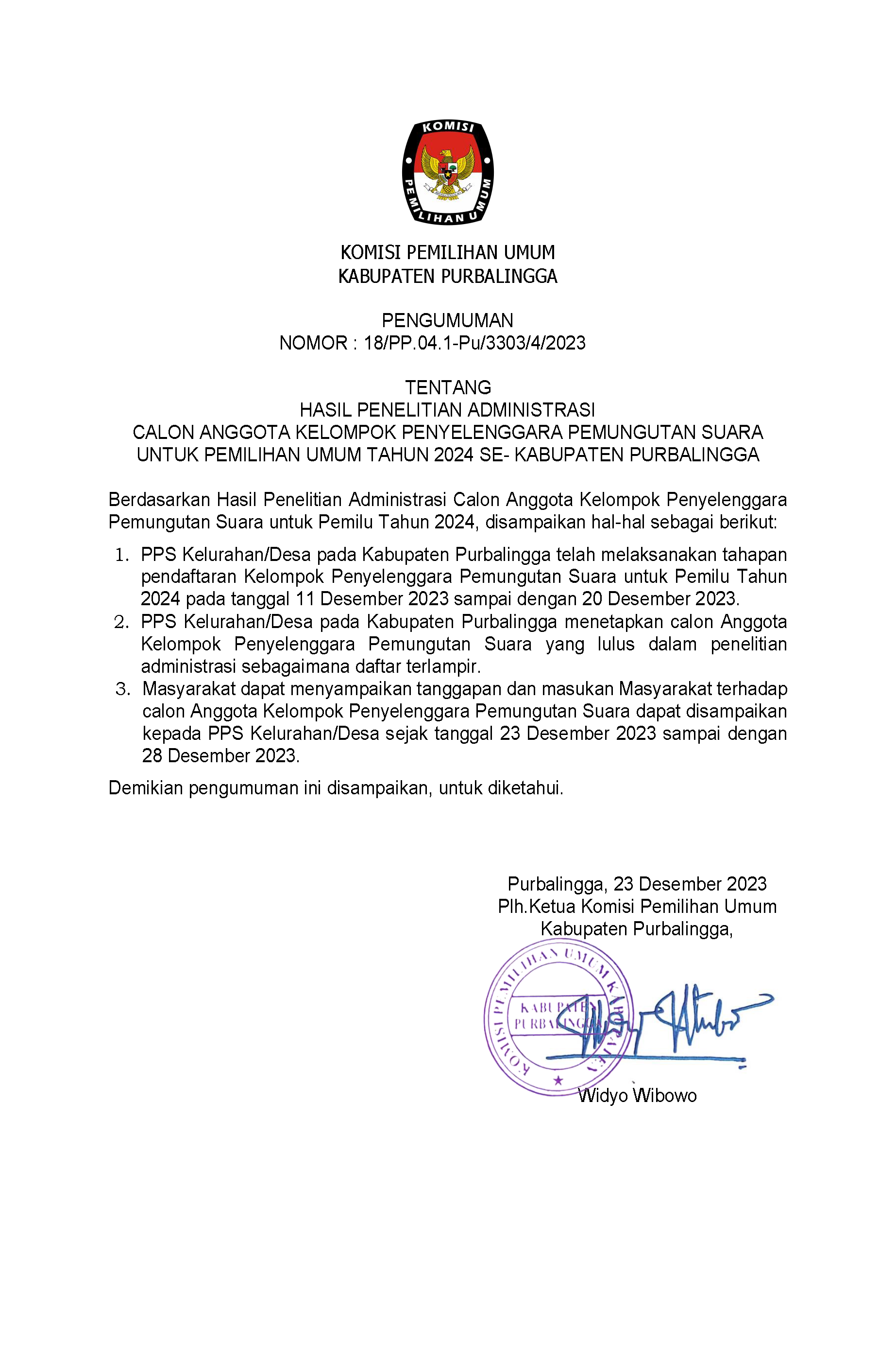 Pengumuman Hasil Penelitian Administrasi Calon Anggota Kelompok Penyelenggara Pemungutan Suara (KPPS) untuk Pemilihan Umum Tahun 2024 se Kabupaten Purbalingga dapat dilihat disini.