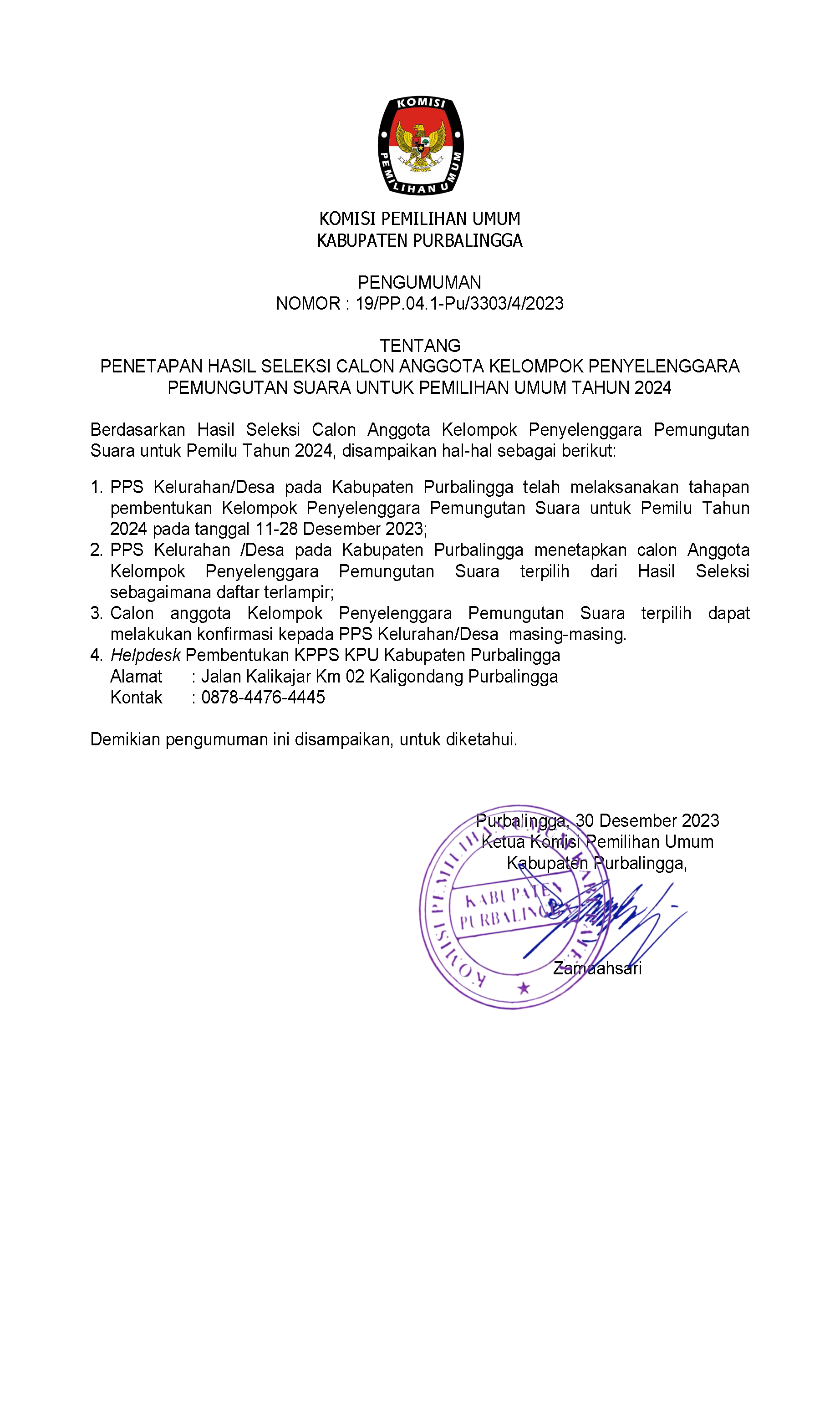 Pengumuman Hasil Seleksi KPPS untuk Pemilu Tahun 2024