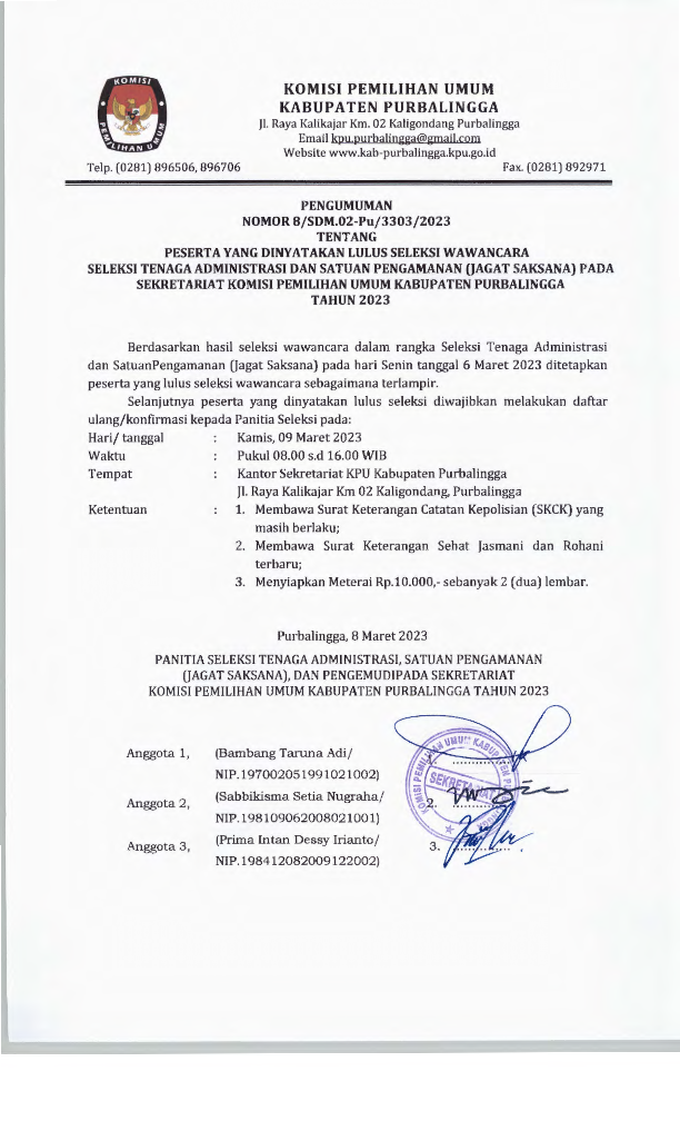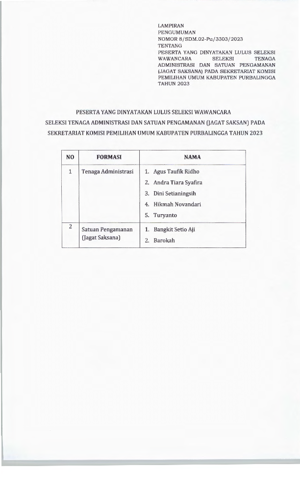 Pengumuman Hasil Seleksi Tenaga Administrasi dan Jagat Saksana KPU Purbalingga 2023