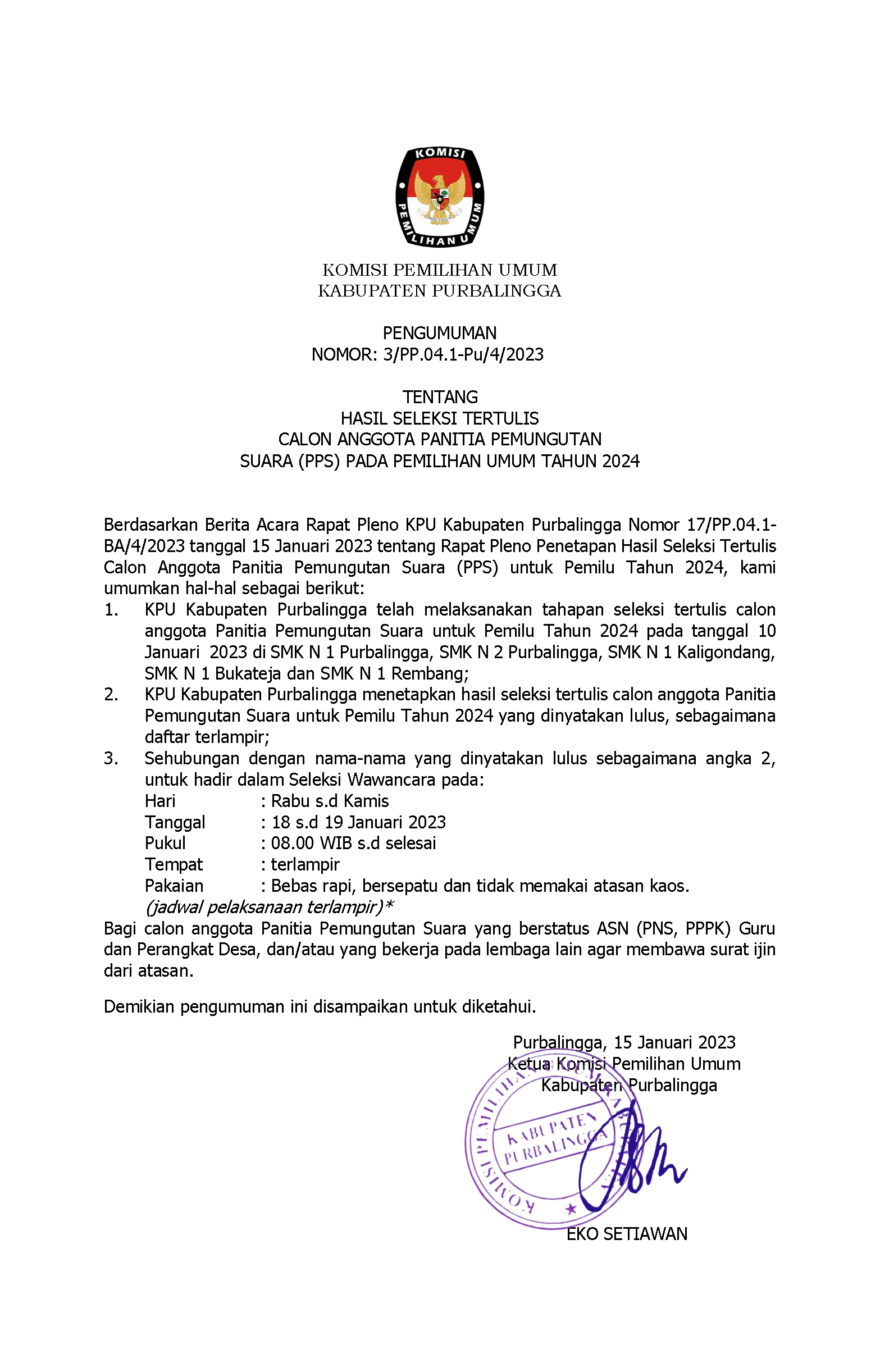 Pengumuman Hasil Seleksi Tertulis Calon Anggota PPS Pemilu 2024