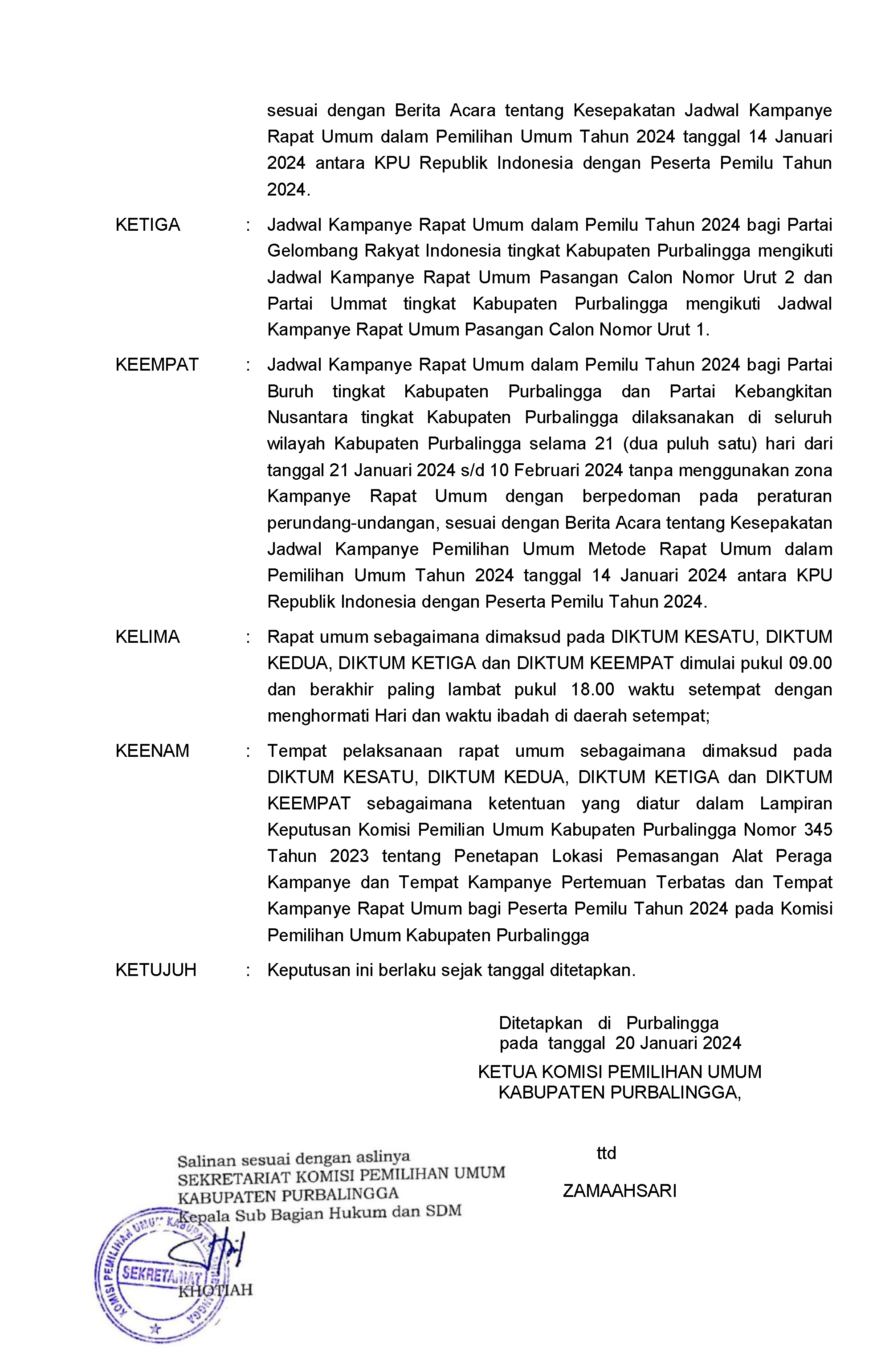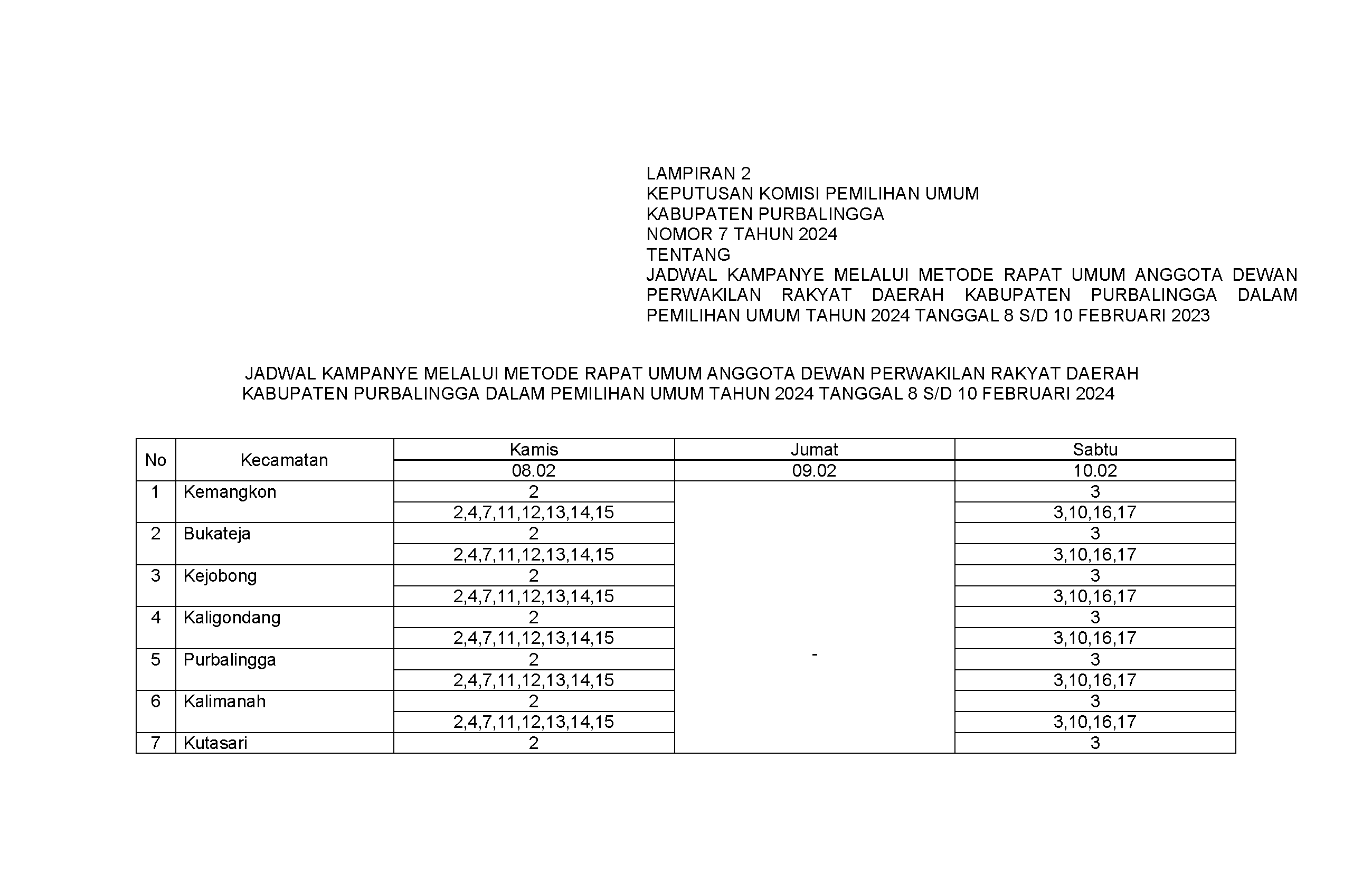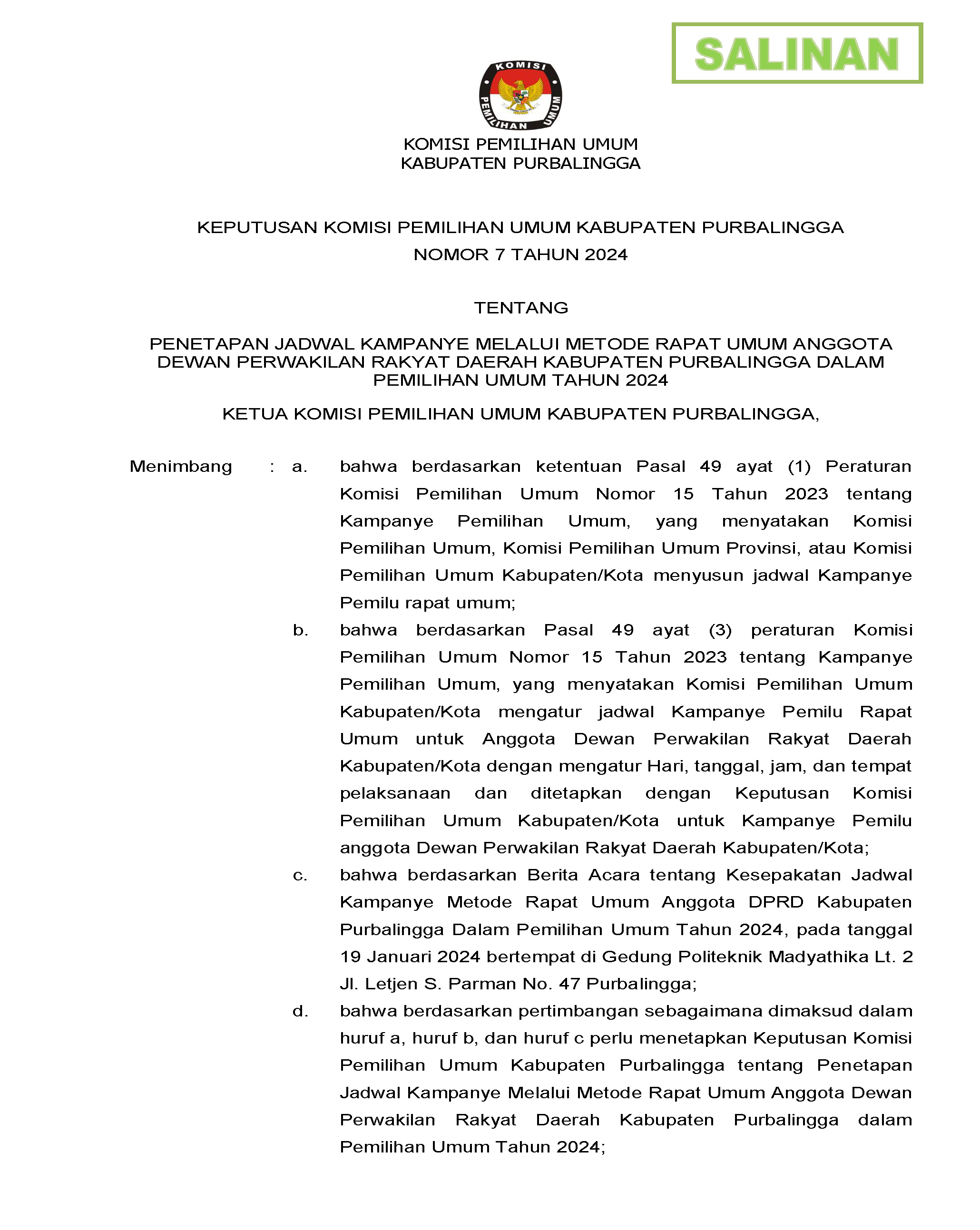 Keputusan Komisi Pemilihan Umum Kabupaten Purbalingga Nomor 7 Tahun 2024 tentang Penetapan Jadwal Kampanye Metode Rapat Umum Anggota Dewan Perwakikan Rakyat Daerah Kabupaten Purbalingga dalam Pemilihan Umum Tahun 2024 dapat diunduh disini.
