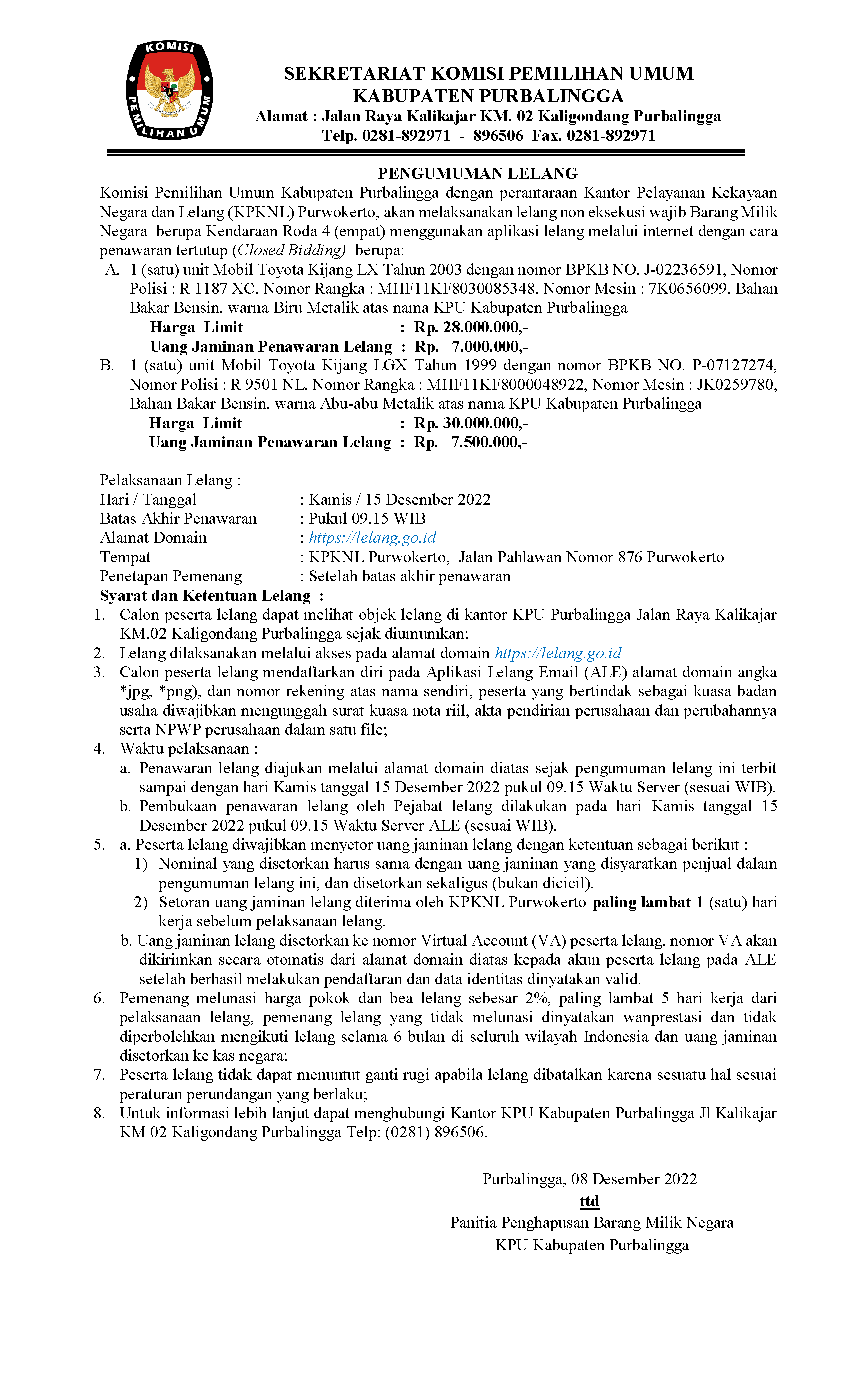 Pengumuman Lelang Non Eksekusi Wajib Barang Milik Negara (BMN) Kendaraan Roda 4 dapat diunduh disini.