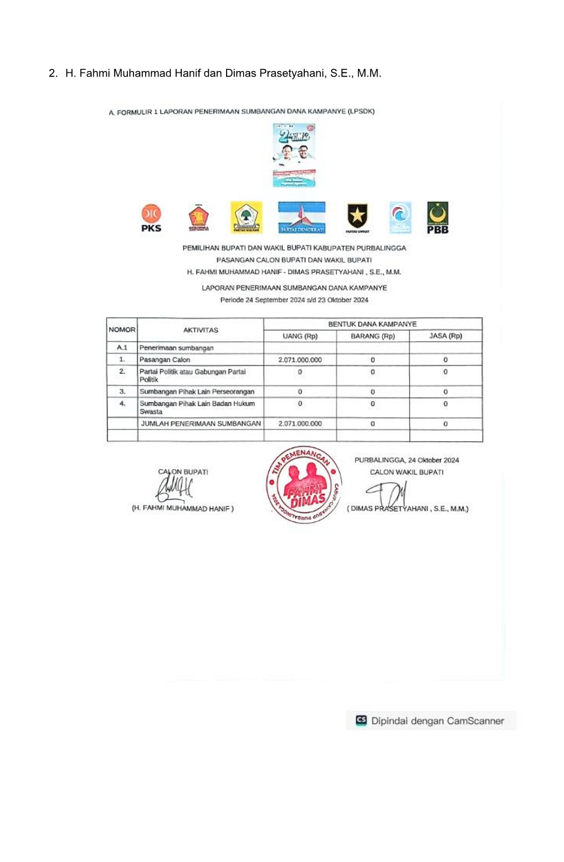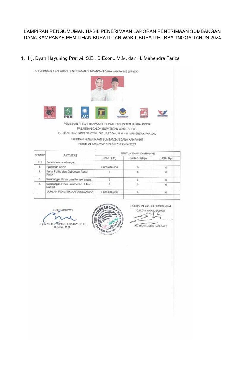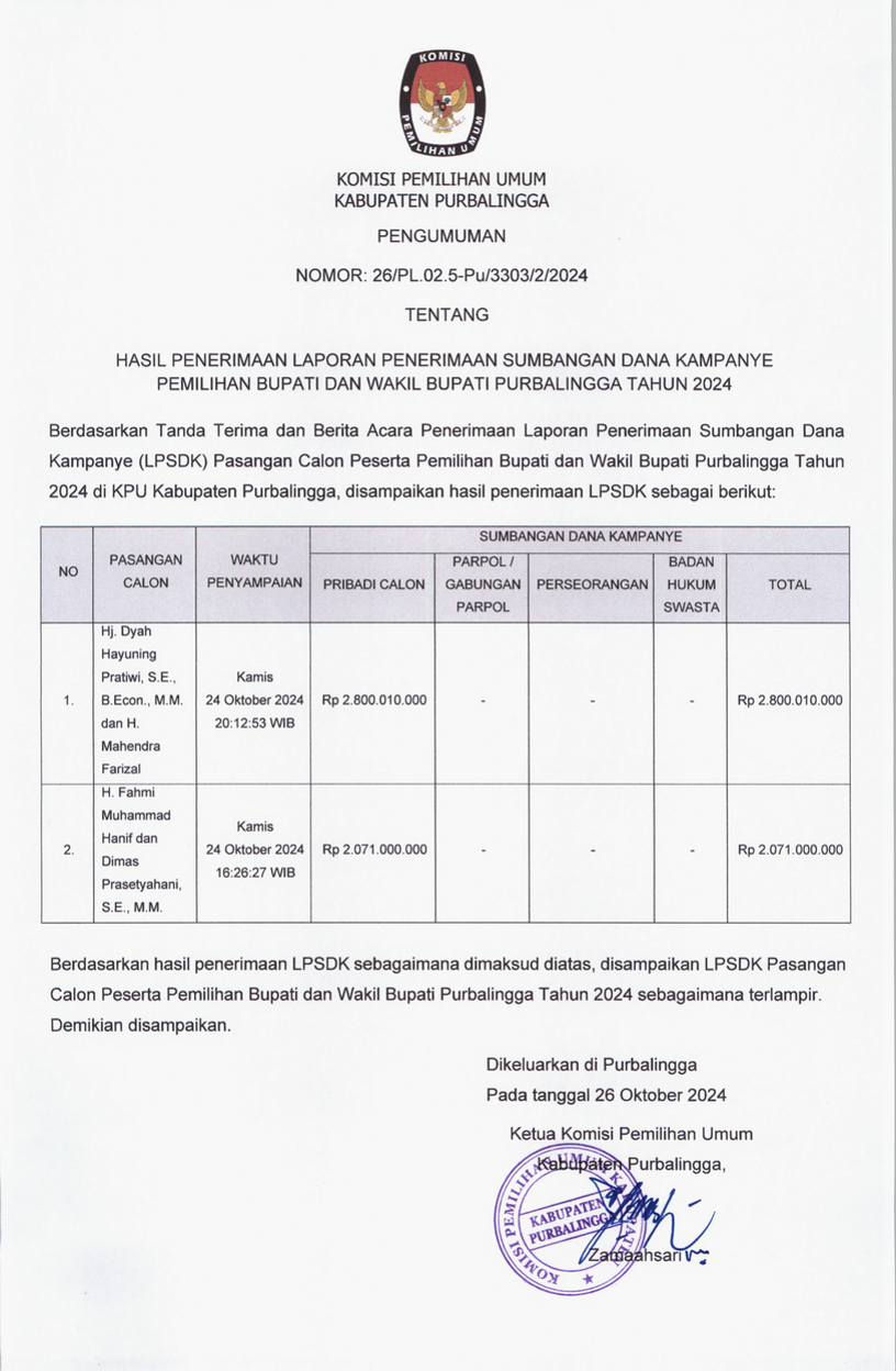 Pengumuman Hasil Penerimaan Laporan Penerimaan Sumbangan Dana Kampanye (LPSDK) Pemilihan Bupati dan Wakil Bupati Purbalingga Tahun 2024 dapat diunduh disini.