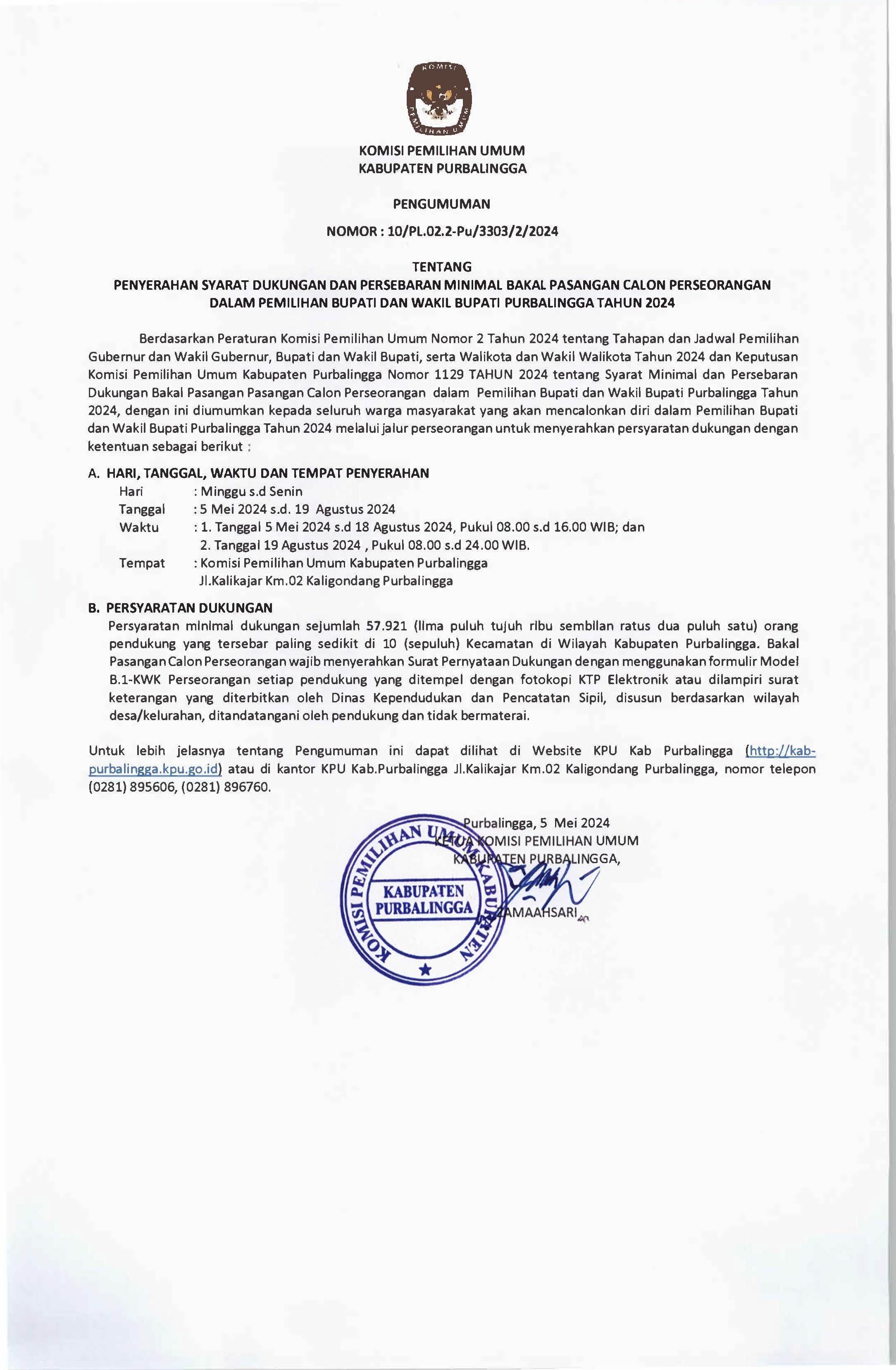 Pengumuman Penyerahan Syarat Dukungan dan Persebaran Minimal Bakal Pasangan Calon Perseorangan dalam Pemilihan Bupati dan Wakil Bupati Purbalingga Tahun 2024 dapat diunduh disini.