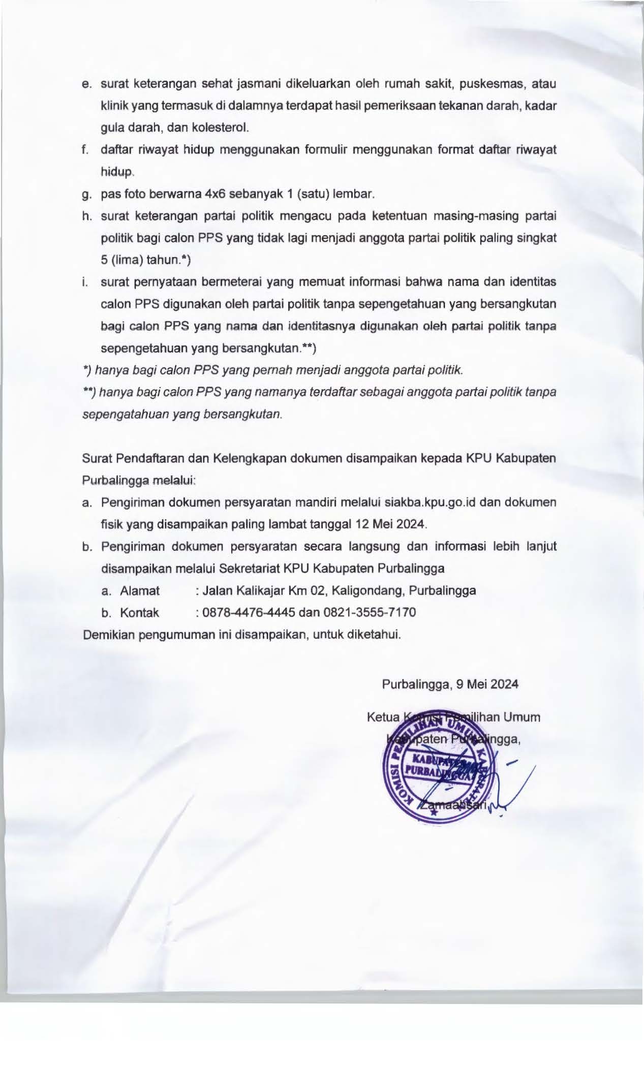 Pengumuman Perpanjangan Pendaftaran Seleksi Calon Anggota Panitia Pemungutan Suara (PPS) untuk Pemilihan Gubernur dan Wakil Gubernur Jawa Tengah, Bupati dan Wakil Bupati Purbalingga Tahun 2024 dapat diunduh disini.