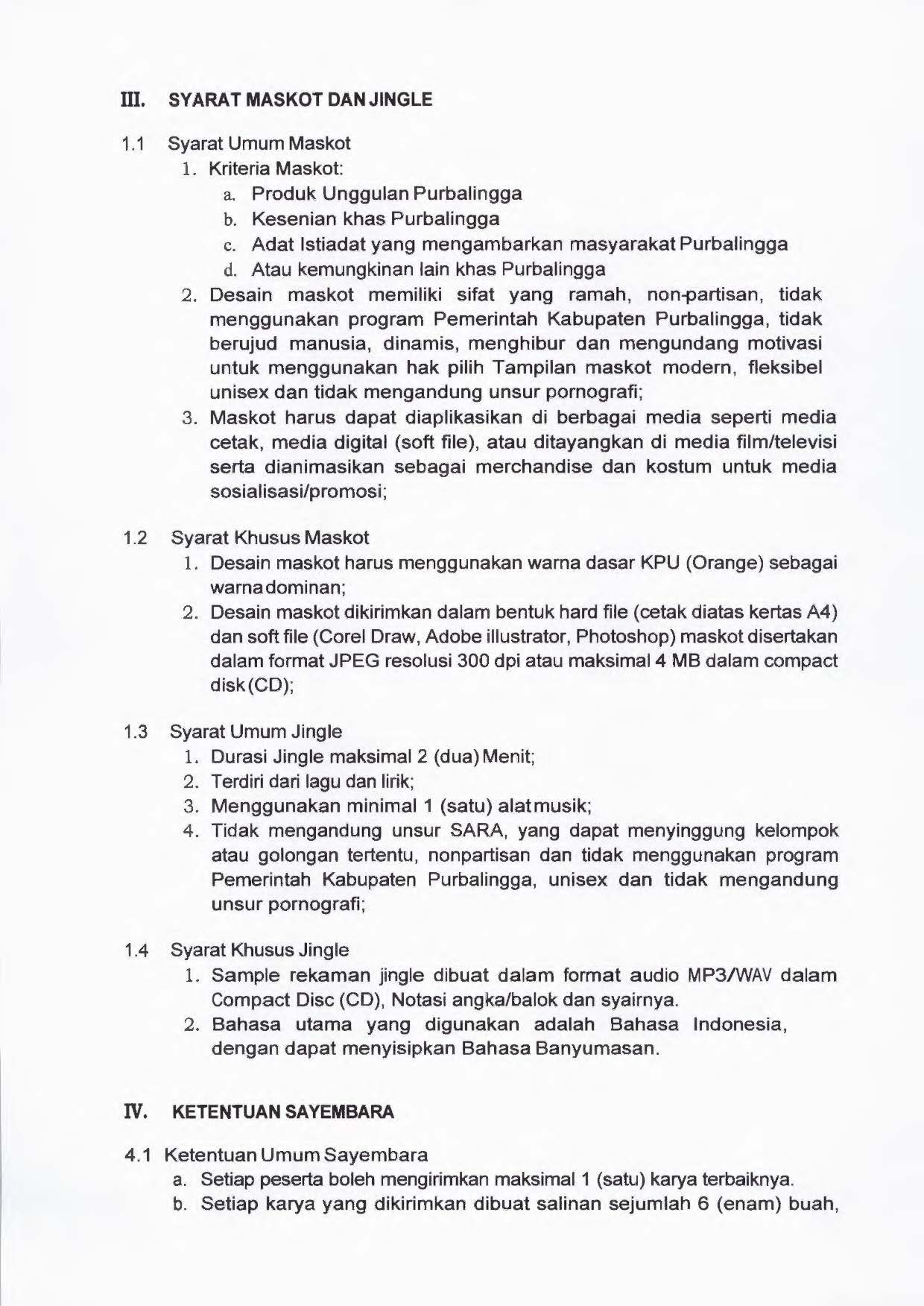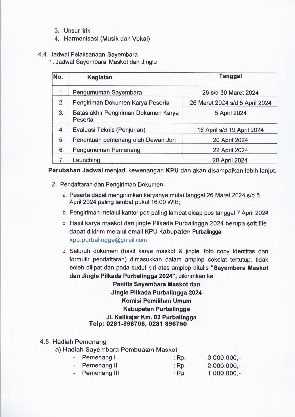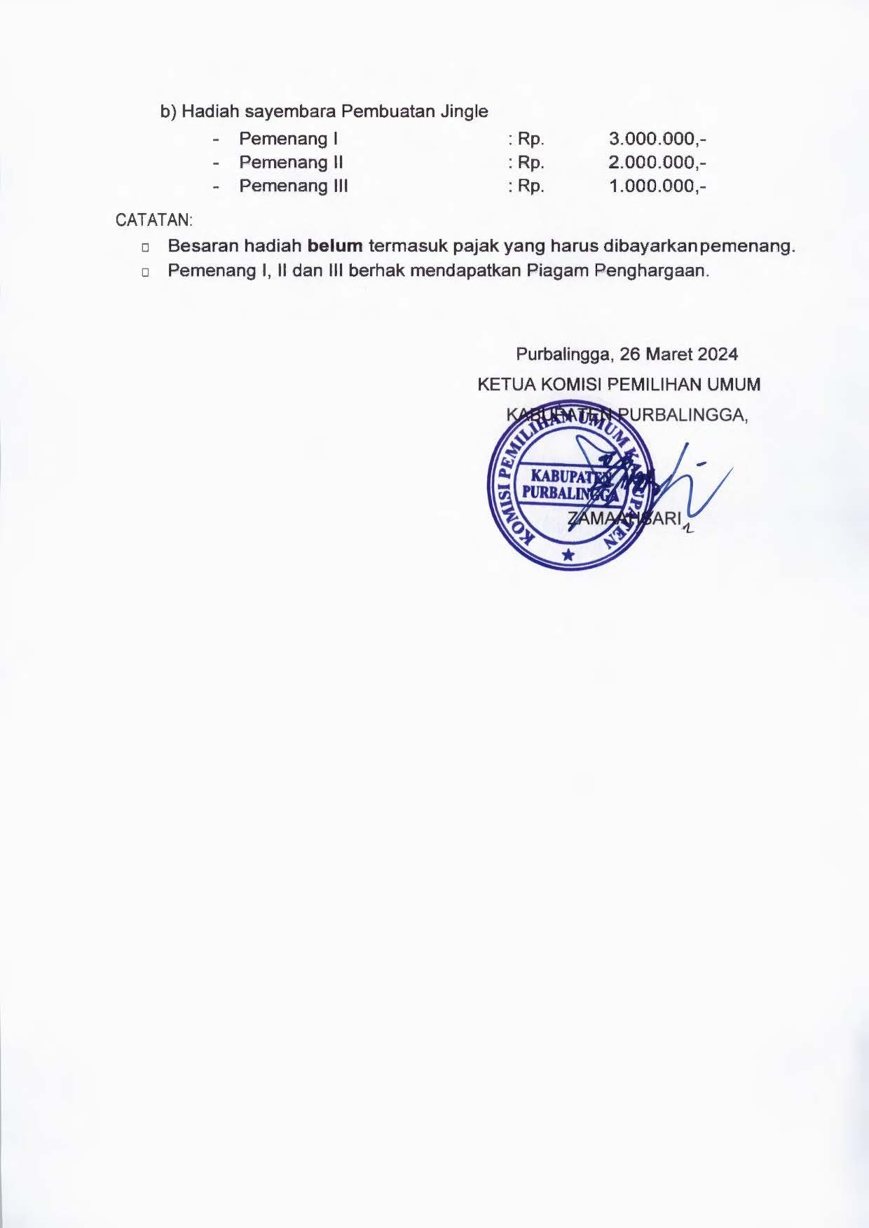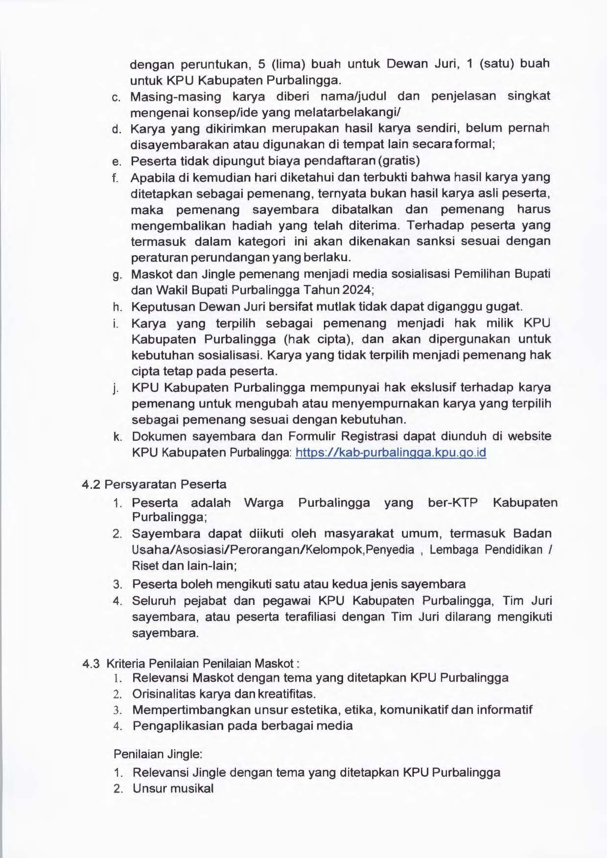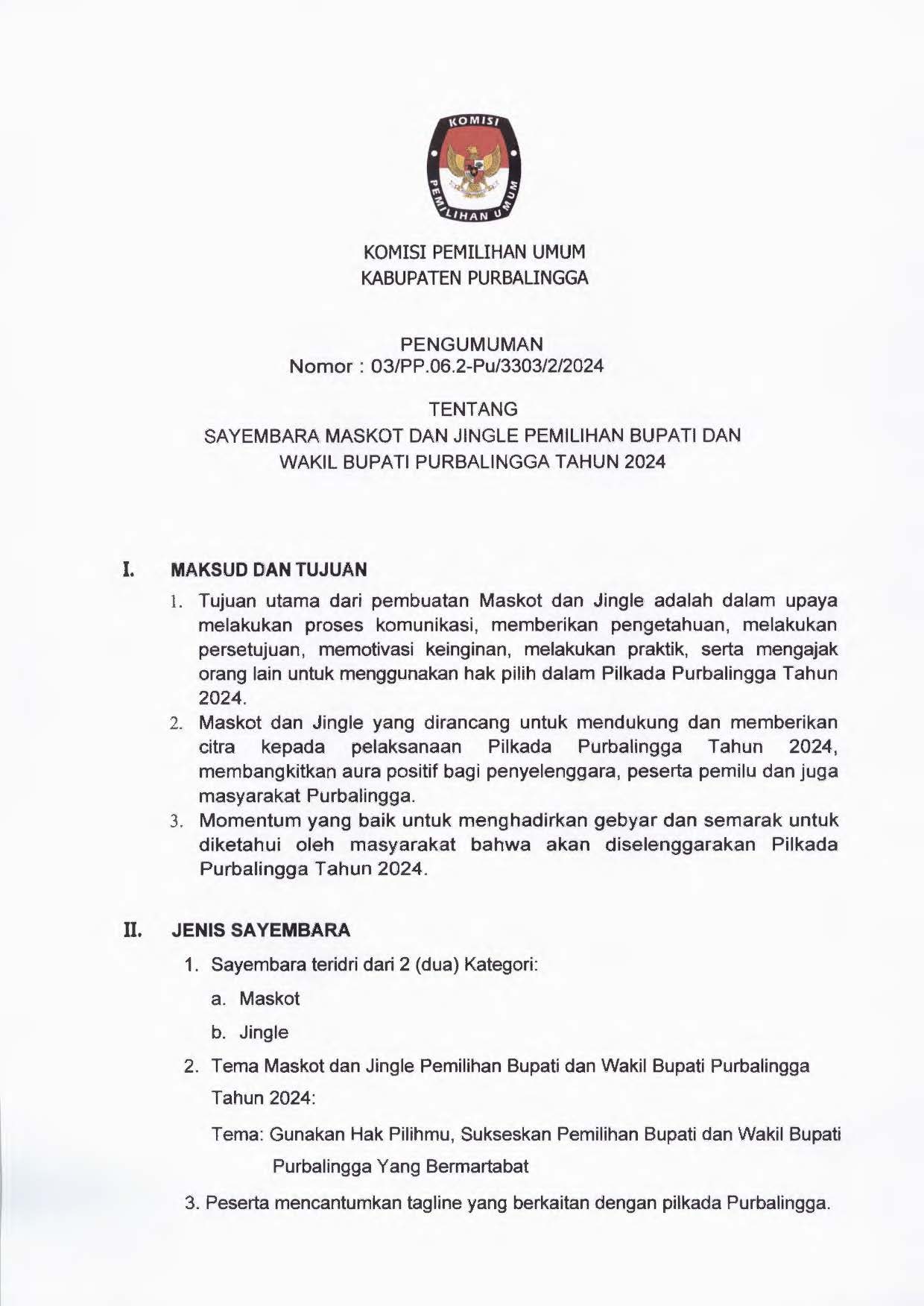 Pengumuman Nomor 03/PP.06.2-Pu/3303/2/2024 tentang Sayembara Maskot dan Jingle Pemilihan Bupati dan Wakil Bupati Purbalingga Tahun 2024 dapat diunduh disini.