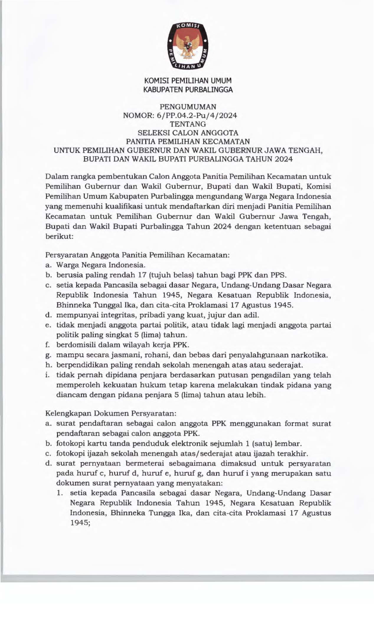 Pengumuman Seleksi Calon Anggota PPK Pilgub Jateng 2024 dan Pilbup Purbalingga 2024