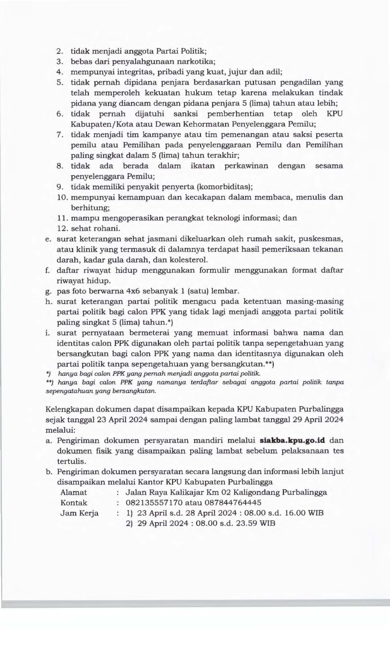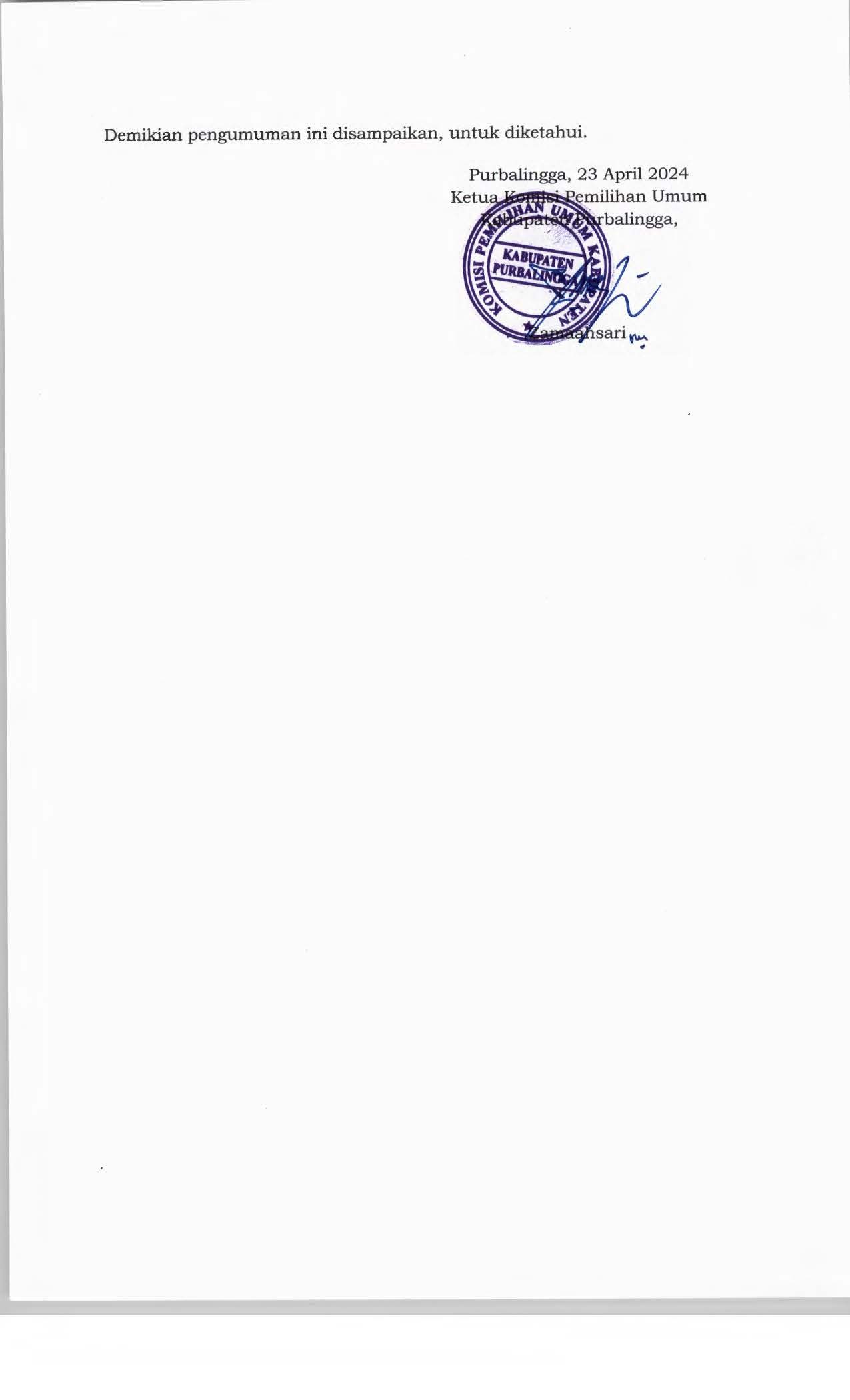 Pengumuman Seleksi Calon Anggota Panitia Pemilihan Kecamatan untuk Pemilihan Gubernur dan Wakil Gubernur Jawa Tengah, Bupati dan Wakil Bupati Purbalingga Tahun 2024 dapat diunduh disini.
