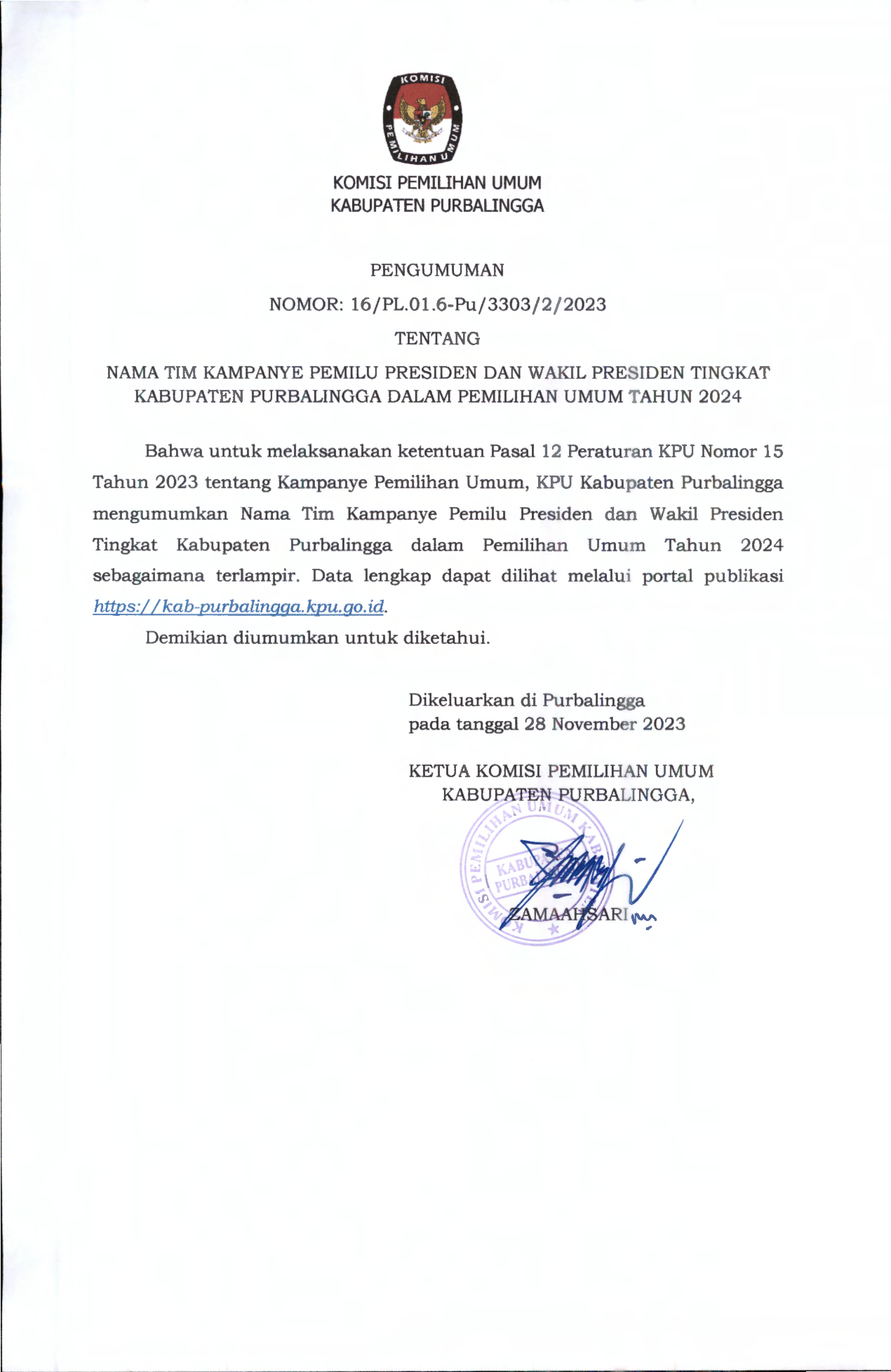 Pengumuman Nama Tim Kampanye Pemilu Presdiden dan Wakil Presiden Tingkat Kabupaten Purbalingga dalam Pemilihan Umum Tahun 2024 dapat diunduh disini.