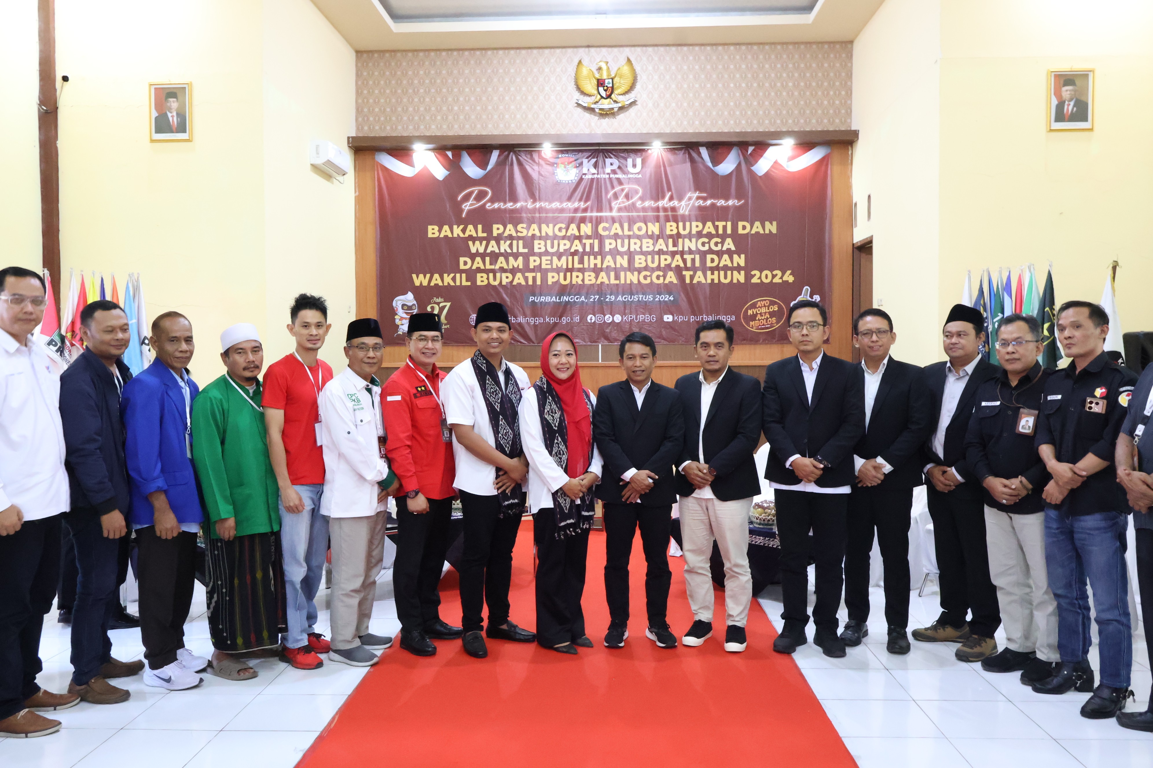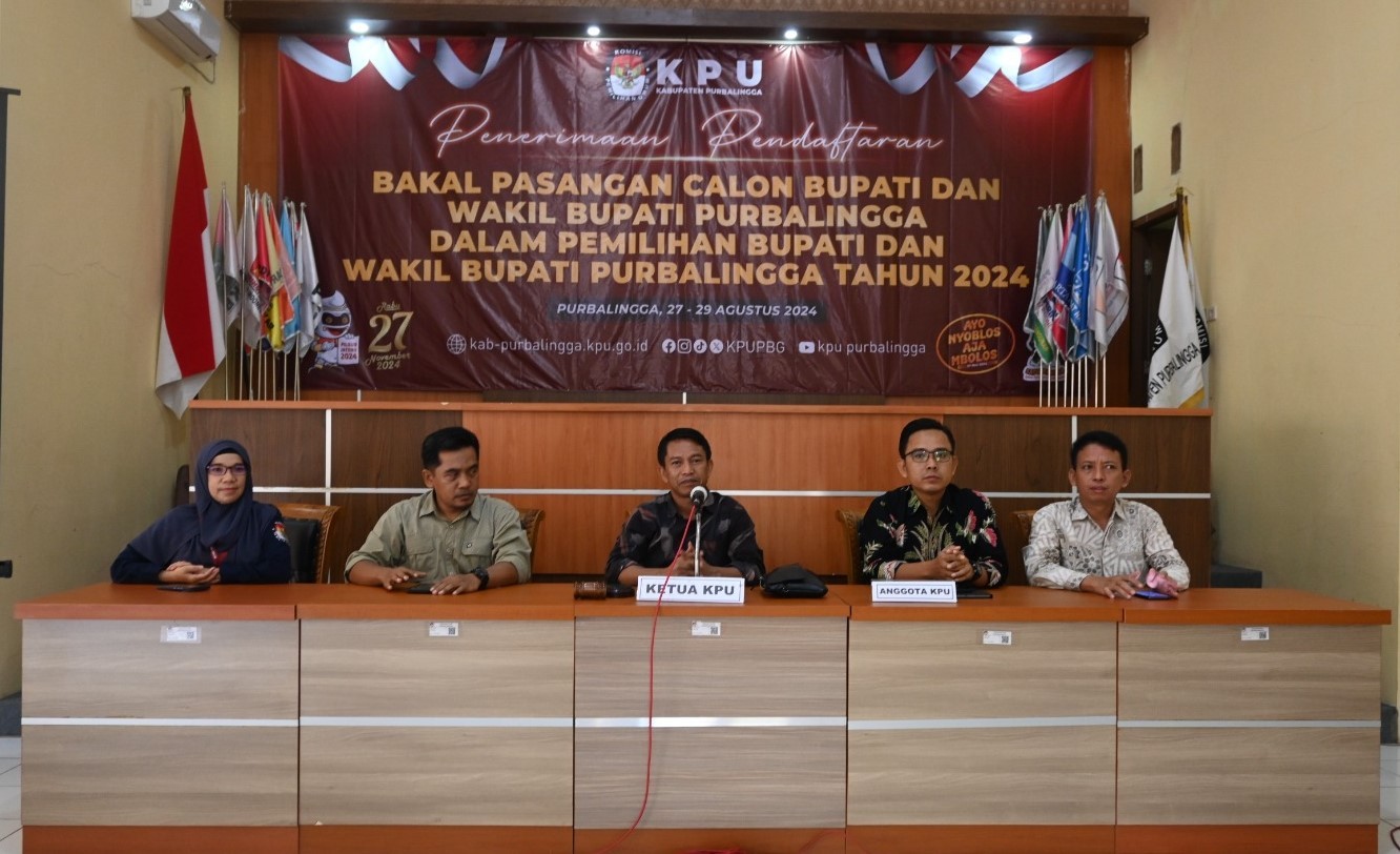 Purbalingga-- Hari pertama jadwal pendaftaran bakal pasangan calon Bupati dan Wakil Bupati Purbalingga Tahun 2024, Selasa (27/8), KPU Kabupaten Purbalingga telah resmi membuka penerimaan pendaftaran bakal pasangan calon tepat pada pukul 08.00 WIB bertempat di Aula KPU Kabupaten Purbalingga. Terpantau belum ada pemberitahuan bakal pasangan calon yang mendaftar ke KPU Kabupaten Purbalingga pada hari ini Selasa, 27 Agustus 2024. Sebagaimana PKPU No. 8 Tahun 2024 jadwal pendaftaran pasangan bakal calon Bupati dan Wakil Bupati Purbalingga Tahun 2024 dimulai pada Selasa, 27 Agustus 2024 sampai dengan Kamis, 29 Agustus 2024. Adapun jadwal penerimaan pendaftaran pada hari Selasa, 27 Agustus 2024 dan Rabu, 28 Agustus 2024 akan dimulai pada pukul 08.00 WIB sampai dengan pukul 16.00 WIB. Sementara pada hari terakhir yakni Kamis, 29 Agustus 2024 penerimaan dimulai pada pukul 08.00 WIB sampai dengan pukul 23.59 WIB. Secara teknis, partai politik pengusul bersama dengan bakal pasangan calon Bupati dan Wakil Bupati Purbalingga Tahun 2024 wajib menginformasikan satu hari sebelum melakukan pendaftaran. Partai pengusul, bakal pasangan calon beserta dengan pendukung diperbolehkan memasuki Aula KPU Kabupaten Purbalingga dengan dibatasi sejumlah 50 personil. Sementara pendukung lainnya dapat menyaksikan prosesi penerimaan pendaftaran melalui layar yang sudah tersedia di sisi kanan Aula. Demi keamanan dan kenyamanan setiap pendukung yang diperbolehkan masuk ke area kantor KPU Kabupaten Purbalingga adalah yang menggunakan ID Card yang sudah disediakan oleh KPU Kabupaten Purbalingga. Penerimaan pendaftaran bakal pasangan calon Bupati dan Wakil Bupati Purbalingga Tahun 2024 wajib menggunakan aplikasi Sistem Informasi Pencalonan (Silon) di mana setiap bakal pasangan calon wajib memiliki admin Silon yang didaftarkan oleh KPU Kabupaten Purbalingga. Selanjutnya, para admin tersebut akan mengunggah dokumen persyaratan pencalonan dan syarat calon ke dalam Silon untuk diverifikasi oleh Admin Silon KPU Kabupaten Purbalingga. Pada saat prosesi penerimaan pendaftaran bakal pasangan calon sudah membawa dokumen persyaratan pencalonan dalam bentuk hardcopy dan sudah terunggah di Silon dan syarat calon hanya yang terunggah di Silon. Selesainya penerimaan pendaftaran bakal pasangan calon akan ditandai dengan serah terima Berita Acara Penerimaan Pendaftaran Bakal Pasangan Calon.