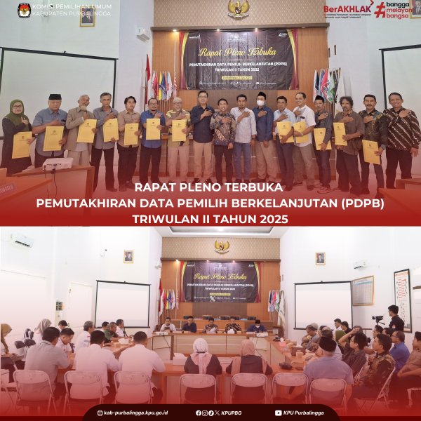 Purbalingga -- Komisi Pemilihan Umum Kabupaten Purbalingga menggelar Rapat Pleno Terbuka Pemutakhiran Data Pemilih Berkelanjutan (PDPB) Triwulan Kedua Tahun 2025 pada Rabu, (2/7/05) di Aula KPU Kabupaten Purbalingga. Rapat pleno dipimpin Ketua KPU Purbalingga Zamaahsari, bersama Anggota KPU Purbalingga Catur Sigit Prastyo, Imam Nurhakim, Sudarmadi, Widyo Wibowo. Hadir sebagai peserta pleno terbuka yakni Ketua dan anggota Bawaslu Purbalingga, perwakilan Polres Purbalingga, Kodim 0702 Purbalingga, Dinpendukcapil, Dinpermasdes, Kesbangpolinmas, Rutan Kelas IIB Purbalingga, SMK N 3 Purbalingga, dan seluruh pimpinan atau perwakilan Partai Politik tingkat Kabupaten Purbalingga. Membuka rapat pleno, Zam menyampaikan bahwa rekapitulasi daftar pemilih berkelanjutkan diamanatkan untuk direkapitulasi oleh KPU Kabupaten/Kota setiap tiga bulan sekali dalam bentuk rapat pleno terbuka. "Sebagai amanat PKPU No. 1 tahun 2025 kami diamanatkan untuk melalukan rekapitulasi PDPB setiap 3 bulan sekali," jelasnya. Zam juga menambahkan bahwa sesuai dengan Pasal 19 ayat 3 bahwa rekapitulasi data pemilih berkelanjutan dilakukan dalam rapat pleno terbuka dengan mengundang Bawaslu, Dinpendukcapil dan instansi terkait. "Dalam hal ini kami mengundang Bawaslu, Polres Purbalingga, Dandim 0702 Purbalingga, Dinpendukcapil, Dinpermasdes, Kesbangpolinmas, Rutan Purbalingga, SMK N 3 Purbalingga, dan pimpinan partai politik tingkat Purbalingga," ungkapnya. Sudarmadi selaku Ketua Divisi Perencanaan Data dan Informasi lanjut merinci data pemilih yang telah dimutakhirkan selama Triwulan II meliputi 8.065 pemilih baru dan 1.936 pemilih tidak memenuhi syarat. Dari pemutakhiran data pemilih berkelanjutan triwulan II tersebut dihasilkan jumlah pemilih di Kabupaten Purbalingga menjadi 781.573 pemilih yang terdiri dari 394.169 pemilih laki-laki dan 387.404 pemilih perempuan. Ketua Bawaslu Purbalingga Misrad menanyakan tentang rincian data pemilih tidak memenuhi syarat yang telah dimutakhirkan dilanjutkan dengan penjelasan dari Kadiv Perencanaan Data dan Informasi Sudarmadi. Sementara itu, anggota Bawaslu Purbalingga Wawan Eko Mujito menyampaikan bahwa Bawaslu juga turut mengawasi proses pemutakhiran data pemilih berkelanjutan utamanya dalam bentuk pencegahan. "Kami sudah menyampaikan beberapa data terkait dengan Daftar Pemilih Tambahan pada Pilkada 2024 untuk dilakukan pengecekan," ujarnya. Ia juga menilai bahwa saat ini kesadaran masyarakat masih rendah dalam mengurus administrasi kependudukan utamanya untuk administrasi kematian. "Kami menilai ini menjadi salah satu kendala, di sisi lain kami juga berharap untuk pemutakhiran data pemilih bisa lebih akurat sehingga tidak ada lagi data yang anomali." tambahnya. Dengan tidak adanya masukan, maka Ketua KPU Purbalingga Zamaahsari membacakan Berita Acara Pleno dilanjutkan dengan pembacaan Keputusan KPU Purbalingga Nomor 20 tahun 2025 tentang Penetapan Rekapitulasi Pemutakhiran Data Pemilih Berkelanjutan Kabupaten Purbalingga Triwulan Kedua Tahun 2025. Acara diakhiri dengan penyerahan Berita Acara kepada para peserta rapat pleno terbuka.