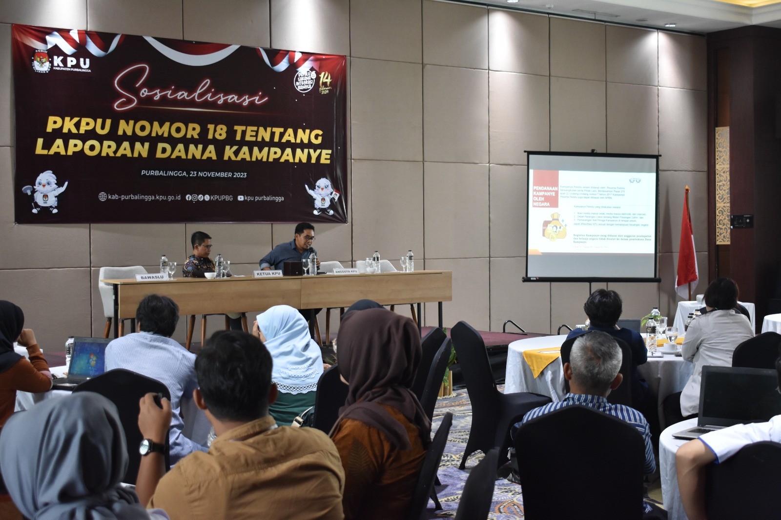 PURBALINGGA -- KPU Kabupaten Purbalingga menyelenggarakan Sosialisasi PKPU Nomor 18 Tahun 2023 tentang Laporan Dana Kampanye dan Bimbingan Teknis Sistem Informasi Kampanye dan Dana Kampanye (Sikadeka) Pemilu Tahun 2024 pada Kamis, 23 November 2023 bertempat di Bima Grand Ballroom Braling Hotel, Purbalingga. Hadir dalam kegiatan tersebut Petugas Penghubung (LO) dan Operator Sikadeka Partai Politik Peserta Pemilu se Kabupaten Purbalingga dan Bawaslu Kabupaten Purbalingga. Kegiatan dibuka dengan sambutan oleh Ketua KPU Kabupaten Purbalingga, Zamaahsari, S.IP., M.IP., yang menyampaikan bahwa sesuai dengan PKPU Nomor 18 Tahun 2023, Laporan Dana Kampanye dimulai pada tanggal 28 November 2023 berbarengan dengan dimulainya hari pertama Kampanye Pemilu Tahun 2024. Zam menjelaskan bahwa dalam laporan dana kampanye, diperlukan Rekening Khusus Dana Kampanye (RKDK) yang akan dijadikan wadah transaksi penerimaan dan pengeluaran partai politik dalam masa kampanye. Sikadeka kemudian hadir sebgaai alat bantu pencatatan bagi partai politik dan pemantauan oleh KPU. Kegiatan dilanjutkan dengan pemaparan materi oleh Anggota KPU Purbalingga Divisi Teknis Penyelemggaraan, Catur Sigit Prastyo, S.Pd.I. yang memaparkan materi terkait kebijakan dana kampanye pada Pemilu 2024. Tahapan Dana Kampanye dimulai dengan pembukaan RKDK yang harus sudah dimiliki oleh partai politik paling lambat pada 27 November 2023 atau 1 (satu) hari sebelum masa kampanye. Selain itu dijelaskan pula terkait sumber dan bentuk dana kampanye bagi partai politik. KPU juga akan memfasilitasi kegiatan kampanye, seperti pemasangan baliho alat peraga kampanye. Pasca pemaparan materi, kegiatan dilanjutkan dengan bimbingan teknis penggunaan Sikadeka partai politik oleh Admin Sikadeka KPU Purbalingga, Fransisca Mega Lestari, S.E., M.A. Pada prinsipnya pengguna utama Sikadeka adalah partai politik, KPU hanya melakukan pemantauan aktivitas kampanye dan penerimaan laporan dana kampanye. Bimbingan teknis lebih banyak memperkenalkan fitur-fitur utama Sikadeka yang terbagi ke dalam menu Kampanye dan Dana Kampanye. Pada menu Kampanye, partai politik melakukan penginputan data-data kegiatan kampanye partai politik yang akan dijalankan nantinya seperti petugas kampanye, lokasi, waktu, jumlah massa termasuk Surat Tanda Terima Pemberitahuan (STTP) Kampanye Pemilu dari pihak Kepolisian. Partai politik juga harus menginput data-data media sosial yang digunakan untuk berkampanye, baik milik partai politik ataupun milik calon. Sementara pada menu Dana Kampanye berkaitan dengan proses keluar masuk baik uang, barang maupun jasa yang terjadi selama kegiatan kampanye. Sikadeka didesain untuk kemudian mensinkronisasi kegiatan kampanye dengan arus keluar masuk uang dan/atau barang. Sehingga nantinya pasca tahapan kampanye selesai, partai politik tidak dibingungkan dalam penyusunan Laporan Penerimaan dan Penggunaan Dana Kampanye (LPPDK). Kegiatan kemudian ditutup dengan diskusi dan tanya jawab antara peserta dan narasumber. Pasca kegiatan ini diharapkan partai politik segera melakukan pengisian data pada akun Sikadeka. KPU Purbalingga sendiri membuka helpdesk khusus yang akan membantu proses input data dari partai politik.