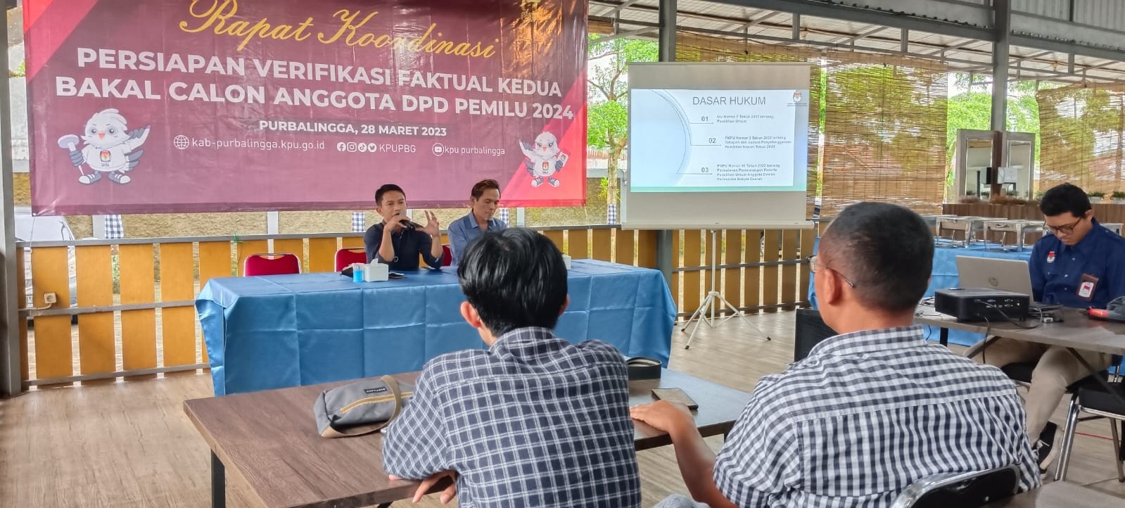 PURBALINGGA -- KPU Kabupaten Purbalingga menyelenggarakan Rapat Koordinasi Persiapan Verifikasi Faktual Kedua Bakal Calon Anggota Dewan Perwakilan Daerah (DPD) Pemilihan Umum Tahun 2024 pada Selasa, 28 Maret 2023 bertempat di Rumah Makan Seafood 87 Purbalingga. Hadir dalam kegiatan tersebut Panitia Pemilihan Kecamatan (PPK), Panitia Pemungutan Suara (PPS), dan Bawaslu Kabupaten Purbalingga. Petugas Penghubung dari bakal calon juga menjadi terundang namun tidak dapat hadir karena masih berada di luar kota. Kegiatan dibuka dan langsung dilanjutkan dengan pemaparan materi oleh Anggota KPU Purbalingga Divisi Teknis Penyelenggaraan, Zamaahsari, S.IP., M.IP. yang dalam pemaparan materinya menjelaskan bahwa dari 4 bakal calon yang mengikuti tahapan verfak kedua, Kabupaten Purbalingga hanya mendapat sebaran dari 1 bakal calon atas nama Taj Yasin. Jumlah dukungan sendiri sebanyak 41 dukungan, yang sudah diverifkasi administrasi dengan hasil 40 dukungan Memenuhi Syarat (MS) dan 1 dukungan Tidak Memenuhi Syarat (TMS). Dari jumlah 40 dukungan kemudian yang menjadi sampel dalam tahapan verfak kedua sebanyak 36 pendukung, dengan sebaran berada di 4 desa di 3 kecamatan, yaitu Desa Karanggedang Kecamatan Bukateja, Desa Brakas dan Ponjen Kecamatan Karanganyar, dan Desa Bantarbarang Kecamatan Rembang. Pelaksanaan verfak kedua sendiri menurut jadwal tahapan dilakukan mulai 26 Maret - 8 April 2023, namun untuk kepastian pelaksanaan KPU Purbalingga akan berkoordinasi dengan Petugas Penghubung terlebih dahulu. Maka yang menjadi tugas dari PPK dan PPS daerah yang terkena sampel adalah melakukan pemetaan terhadap pendukung tersebut. Zam juga memberikan sedikit catatan evaluasi terhadap kegiatan verfak pertama untuk menjadi bahan evaluasi bagi verifikator. Pengarahan juga diberikan oleh Anggota KPU Purbalingga Divisi Sosdiklih, Parmas dan SDM, Andri Supriyanto, S.Pd. yang menekankan akan pentingnya menjaga integritas dalam setiap menjalankan tahapan. Andri juga menekankan akan pentingnya pencatatan kronologis, dokumentasi dan berkas administratif dari setiap kegiatan yang dijalankan mengingat hal-hal tersebut yang menjadi bukti dari kerja-kerja yang telah dilakukan. Kegiatan dilanjutkan dengan pemaparan materi oleh Anggota Bawaslu Purbalingga Divisi Hukum dan Penyelesaian Sengketa, Teguh Irawanto, S.IP. yang memaparkan bahwa yang dilakukan oleh Panwas Kelurahan Desa dan Panwaslucam dalam setiap kegiatan merupakan bentuk pelaksanaan tugas dan fungsi dari Bawaslu Purbalingga dalam tahapan verfak, maka dimohon kerjasamanya sehingga tahapan bisa berjalan dengan lancar. Kegiatan kemudian ditutup dengan buka bersama dengan seluruh peserta kegiatan.