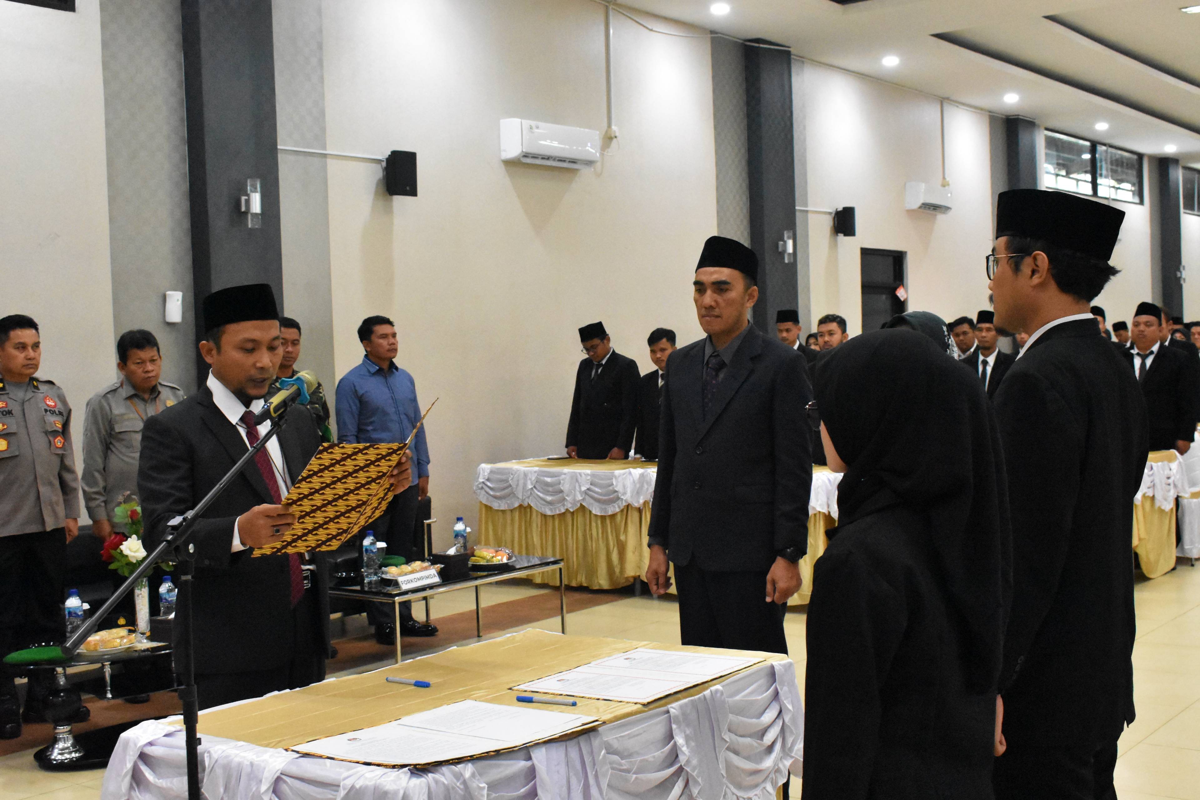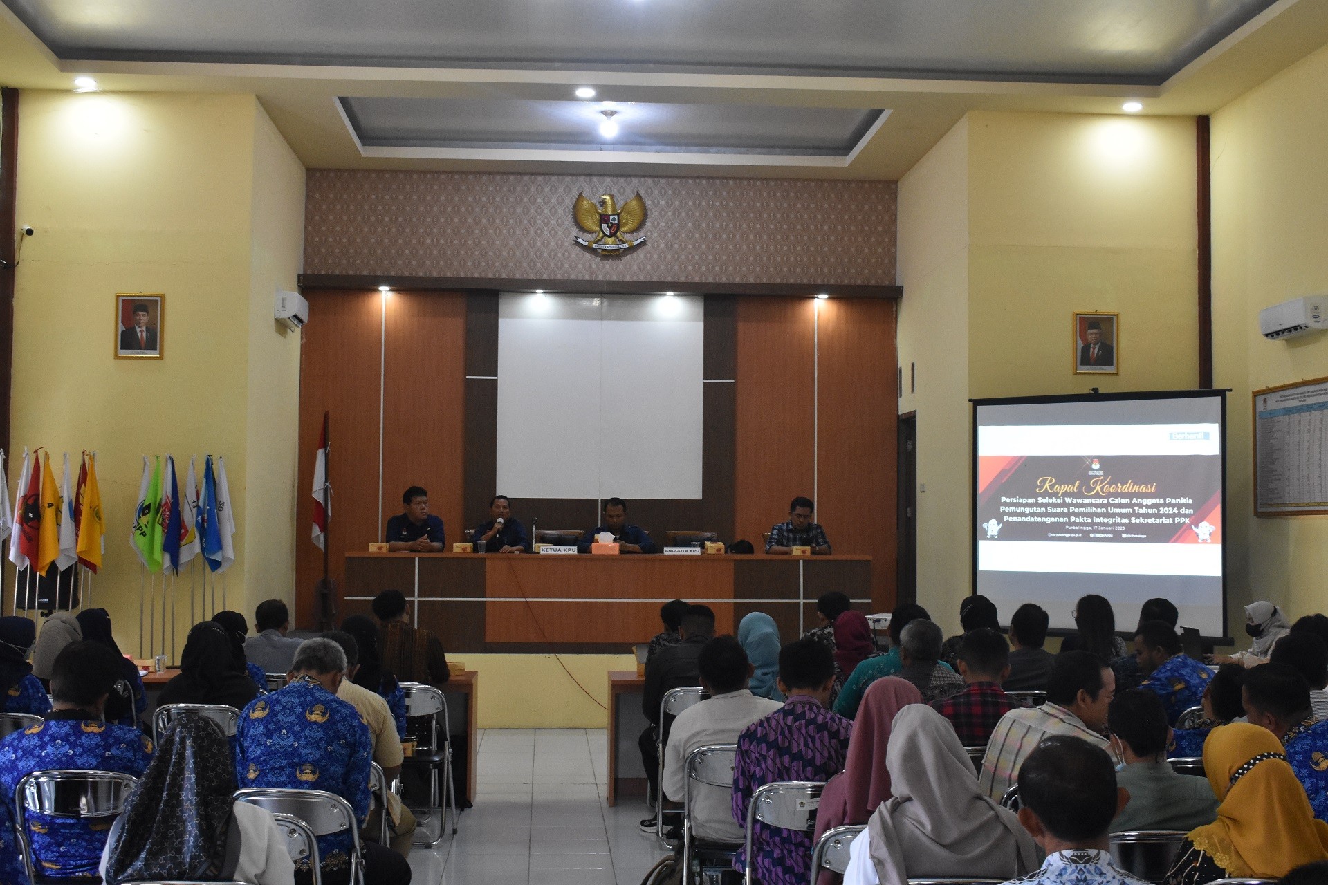 PURBALINGGA – KPU Kabupaten Purbalingga menyelenggarakan Pengambilan Sumpah Janji dan Pelantikan Panitia Pemungutan Suara atau PPS Pemilihan Umum tahun 2024 pada hari Selasa, 24 Januari 2023 di GOR Sasana Krida Purbalingga. Turut hadir dalam acara, jajaran Forkompimda, Kepala Instansi/Organisasi Perangkat Daerah terkait, Forkompimcam, dan Kepala Desa/Lurah Se Kabupaten Purbalingga. Acara diawali dengan pelantikan langsung 717 orang anggota PPS oleh Ketua KPU Kabupaten Purbalingga Eko Setiawan, S.T. didampingi saksi dan rohaniawan. PPS Pemilu 2024 terlantik kemudian diambil sumpah janji dan menandatangani pakta integritas sebagai tanda telah resmi menjalankan tugas terhitung mulai tanggal 24 Januari 2023 - 4 April 2024. Acara kemudian dilanjutkan dengan sambutan oleh Ketua KPU Kabupaten Purbalingga Eko Setiawan, S.T yang menyatakan bahwa Pemilu merupakan arena konflik yang sah untuk mendapatkan kekuasaan. Oleh sebab itu penyelenggara pemilu setelah resmi dilantik dilarang terlibat dalam konflik tersebut, apalagi jika menjadi pemicu atau sumber konflik. Penyelenggara pemilu harus menjaga netralitas. Eko juga menekankan bahwa dalam menjalankan tugas tahapan Pemilu, PPS harus memberikan pelayanan yang ramah karena akan sering bersinggungan langsung dengan masyarakat. Sambutan kedua disampaikan oleh Bupati Kabupaten Purbalingga Dyah Hayuning Pratiwi, S.E., B.Econ.,MM. Dalam sambutannya Bupati Tiwi menyampaikan kepada 717 PPS terlantik agar dalam melaksanakan tugas selalu menjunjung tinggi integritas, netralitas sesuai prinsip dan asas penyelenggara Pemilu. Bupati Tiwi juga menekankan kepada seluruh penyelenggara Pemilu di Kabupaten Purbalingga agar senantiasa menjaga sikap dan tindakan selama menjalankan tahapan Pemilu. Hal ini agar penyelenggaraan Pemilu dan Pilkada Serentak Tahun 2024 dapat berjalan dengan aman, damai, tentram, dan sukses. Setelah Pengambilan Sumpah Janji dan Pelantikan, PPK akan memberikan Bimbingan Teknis Tahapan Pemilu 2024 kepada anggota PPS terlantik. Bimtek tentang tugas, wewenang, dan tanggung jawab PPS dalam melaksanakan tahapan Pemilu akan dilaksanakan oleh masing-masing PPK di tiap Kecamatan.