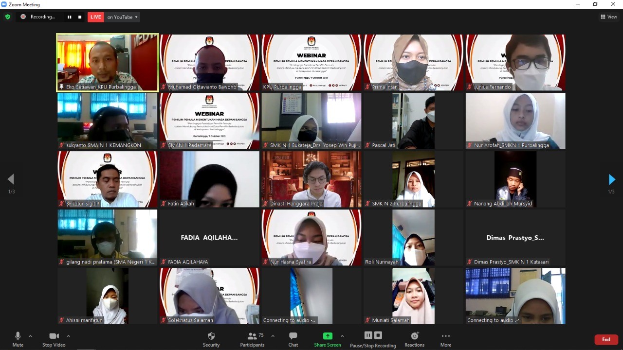 PURBALINGGA – Komisi Pemilihan Umum (KPU) Kabupaten Purbalingga baru saja menyelenggarakan Webinar dengan tajuk “Pemilih Pemula Menentukan Masa Depan Bangsa” pada Kamis, (7/10). Kegiatan webinar ini mengundang para pemilih pemula yang berasal dari para pengurus OSIS SMA, SMK dan MAN di Kabupaten Purbalingga, penegak Pramuka, serta organisasi pelajar yaitu dari IPM, IPNU dan IPPNU. Webinar yang dihadiri oleh 86 peserta yang bergabung melalui aplikasi zoom ini bertujuan untuk sosialisasi kegiatan Pemutakhiran Data Pemilih Berkelanjutan (DPB) kepada pemilih pemula. Diketahui bahwa pemilih pemula merupakan pemilih memiliki peran strategis dalam Pemilu maupun pemilihan, sehingga perlu dipastikan terdaftar pada daftar pemilih. Ketua KPU Kabupaten Purbalingga saat memberikan sambutan mengatakan bahwa generasi pemilih pemula yang nantinya akan menentukan arah pembangunan bangsa pada dasarnya sudah memahami bahwa penting memanfaatkan pemilu atau pemilihan sebagai kanal-kanal penyaluran aspirasi. Namun yang penting adalah bagaimana bisa membentengi dari politik uang, golput, kecurangan, hoax, hatespeech dan penyalahgunaan teknologi dan informasi untuk mengganggu jalannya demokrasi. Di sisi lain, anggota KPU Kabupaten Purbalingga Divisi Perencanaan, Data dan Informasi (Rendatin) Catur Sigit Prastyo yang sekaligus menjadi salah satu narasumber pada Webinar ini mengajak para pemilih pemula untuk mendaftarkan datanya agar hak politiknya dapat terakomodasi dan nantinya dapat menggunakan hak pilih pada saat Pemilu maupun pemilihan. Narasumber kedua, Dinasti Hanggara Praja selaku Kakang Duta Wisata Purbalingga 2019, menjelaskan mengenai peran strategis pemuda dalam kehidupan berbangsa dan bernegara. Menurutnya, ada 4 poin penting yang harus disadari dimiliki oleh anak-anak muda, yakni pertama, anak muda itu memiliki power, pemuda juga memiliki peran sebagai check and balances, terdepan dalam teknologi dan harapannya ke depan dapat menjadi pemilih bijak pada saat ajang Pemilu maupun pemilihan. Antusiasme peserta sangat terlihat dari kehadiran dan tetap bertahan dari awal penyelenggaraan sampai dengan acara Webinar ini selesai. Terdapat 8 partisipan yang bertanya kepada para narasumber dan turut serta mengisi google form untuk melaporkan datanya sebagai pemilih pemula. Sebagai diharapkan, kegiatan Webinar yang juga ditayangkan secara live melalui akun Youtube KPU Kabupaten Purbalingga ini telah mampu menarik minat pemilih pemula untuk terlibat melaporkan datanya sebagai bagian dari kegiatan Pemutakhiran Data Pemilih Berkelanjutan. Harapannya dengan adanya kegiatan sosialisasi seperti ini, ke depan akan lebih banyak pemilih pemula yang bersedia melaporkan datanya. Di sisi lain, para peserta Webinar yang telah hadir diharapkan dapat mensosialisasikan kepada lebih banyak warga Purbalingga tentang kegiatan Pemutakhiran Data Pemilih Berkelanjutan (DPB) di tingkat KPU Kabupaten Purbalingga.