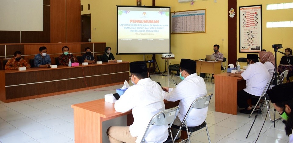 Purbalingga – KPU Kabupaten Purbalingga menyelenggarakan kegiatan Pengumuman Laporan Harta Kekayaan Penyelenggara Negara (LHKPN) Pasangan Calon dalam Pemilihan Bupati dan Wakil Bupati Purbalingga Tahun 2020 pada hari Jum’at, 9 Oktober 2020 di Aula KPU Kabupaten Purbalingga. Kegiatan ini dihadiri oleh Pasangan Calon Nomor Urut 1, Muhammad Sulhan Fauzi, S.E., M.M. – Zaini Makarim Supriyatno, S.T., Pasangan Calon Nomor Urut 2, Dyah Hayuning Pratiwi, S.E., B.Econ., M.M. – H. Sudono, S.T., M.T., dan LO dari masing-masing pasangan calon. Penyampaian Laporan Harta Kekayaan Penyelenggara Negara (LHKPN) disampaikan langsung oleh Pasangan Calon nomor urut 1 dan 2 secara bergantian. Muhammad Sulhan Fauzi melaporkan, harta kekayaannya senilai Rp 6.093.610.440,-. Sementara pasangannya, Zaini Makarim Supriyatno melaporkan harta kekayaannya senilai Rp 5.854.827.223,-. Selanjutnya, Dyah Hayuning Pratiwi melaporkan, harta kekayaannya senilai Rp 7.106.518.273,-. Sementara pasangannya, Sudono melaporkan harta kekayaannya senilai 1.705.415.000,-. Ketua KPU Kabupaten Purbalingga menyampaikan bahwa penyampaian Laporan Harta Kekayaan Penyelenggara Negara (LHKPN) ini tertuang dalam PKPU Nomor 3 Tahun 2017 Pasal 74, yang berbunyi Pasangan Calon mengumumkan laporan harta kekayaan pribadi/pejabat negara hasil penelitian dan/atauklarifikasi Komisi Pemberantasan Korupsi kepada masyarakat,paling lambat 2 (dua) hari sebelum hari pemungutan suara, dengan difasilitasi oleh KPU Provinsi/KIP Aceh atau KPU/KIP Kabupaten/Kota.