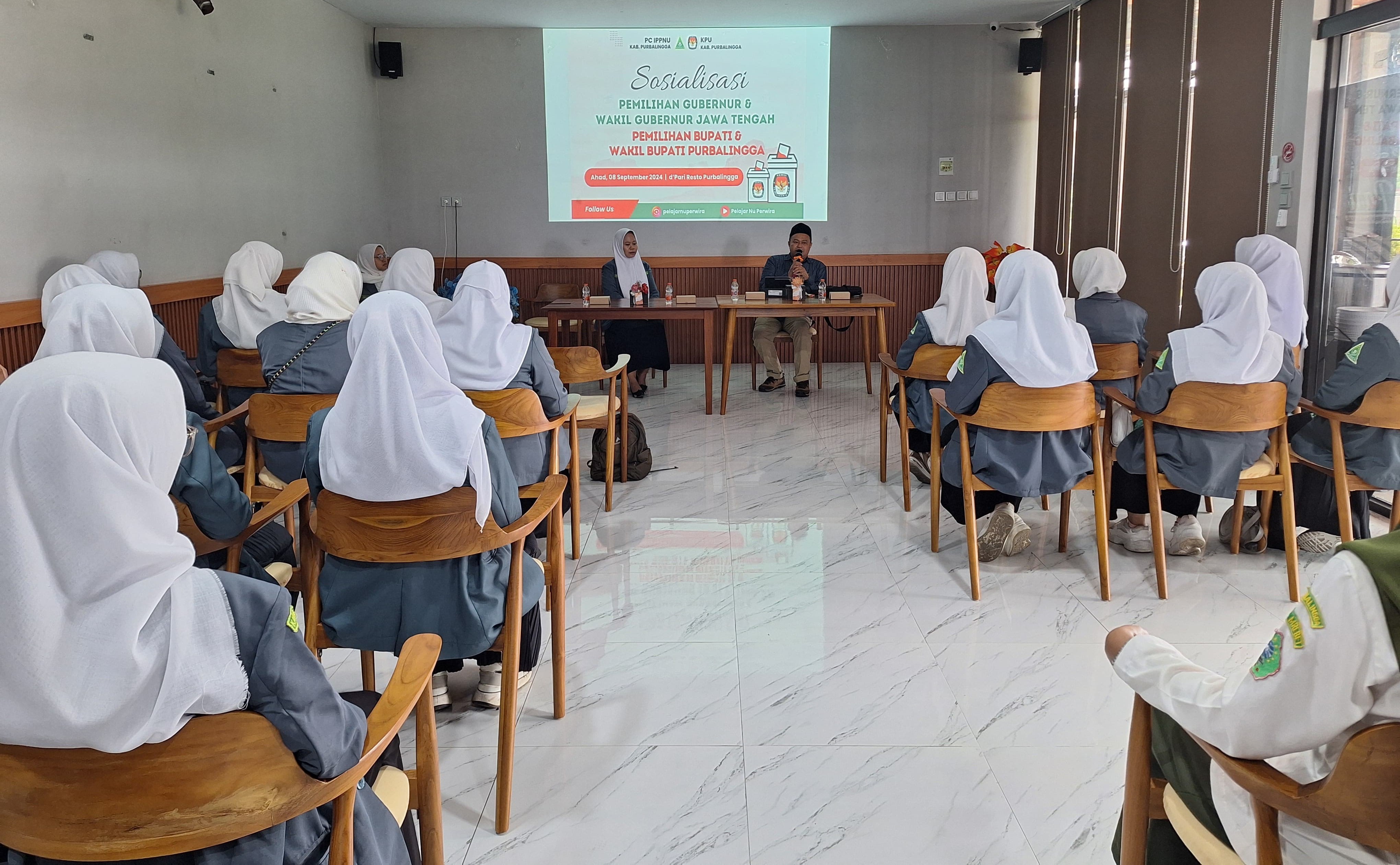 PURBALINGGA— Komisi Pemilihan Umum (KPU) Kabupaten Purbalingga kembali hadir dalam kegiatan sosialisasi Pemilihan Umum (Pemilu) dalam rangka meningkatkan partisipasi masyarakat, khususnya generasi muda. Kegiatan ini diselenggarakan pada Minggu, 8 September 2024, bertempat di d'Pari Resto Purbalingga. Sebagai bagian dari bentuk Kolaborasi antara KPU Purbalingga dan PC IPPNU Purbalingga. Kegiatan diikuti oleh perwakilam IPPNU di setiap Kecamatan. Dimana, kegiatan Ini bertujuan untuk memperdalam pentingnya demokrasi kepada para anggota dan mengajak mereka ikut berperan serta dalam pemilu. Sosialisasi ini juga menekankan pentingnya pemahaman tentang hak dan kewajiban sebagai warga negara dalam memilih pemimpin yang akan membawa masa depan bangsa, "tujuannya agar para anggota IPPNU juga harus melek politik" ungkap Anisa Tuti Lestari Selaku Ketua PC IPPNU Purbalingga di awal acara. Dalam Kesempatan ini Ketua Divisi Sosialisasi Pendidikan Pemilih, Partisipasi Masyarakat dan SDM KPU Kabupaten Purbalingga, Widyo Wibowo,S.Sos hadir menjadi Narasumber langsung bersama tim dari Sekretariat KPU Kabupaten Purbalingga. Dalam Pemaparannya Widyo menyampaikan arti demokrasi, asas-asas dalam pemilu/pemilihan, Tujuan penyelenggaraan pemilu/pemilihan, Syarat menjadi Pemilih dan Tahapan Pilkada 2024 "saat ini Tahapan Pilkada sedang dalam masa Pencalonan, bahwa di Purbalingga sudah ada 2 Pasangan Calon yang sudah resmi mendaftar ke KPU dan saat ini sedang dalam masa Verifikasi Administrasi sebelum di tetapkannya nanti di tanggal 22 September 2024 kemudian di lanjutkan dengan pengundian no urut di tanggal 23 September 2024". Kegiatan ini merupakan bagian dari upaya berkelanjutan KPU Purbalingga dalam meningkatkan kesadaran politik di kalangan pemilih pemula, khususnya di lingkungan Organisasi PC IPPNU Purbalingga. "Dengan adanya kegiatan ini, KPU berharap kepada anggota untuk bisa berperan untuk dapat menyebarkan pentingnya partisipasi dalam pemilu di lingkungan sekitar mereka dan ikut berpartisipasi langsung sebagai bagian dari KPU dalam penyelenggaraan Pilkada nanti, karena KPU sebentar lagi akan merekrut Anggota KPPS di tanggal 17 September 2024" imbuhnya. Acara ini diakhiri dengan ajakan dari KPU Purbalingga kepada peserta agar menjadi pemilih yang bijak dan bertanggung jawab dalam Pemilu mendatang. Diharapkan, dengan adanya sosialisasi seperti ini, tingkat partisipasi pemilih di Purbalingga akan semakin meningkat dan demokrasi di Indonesia semakin kuat.(adv)