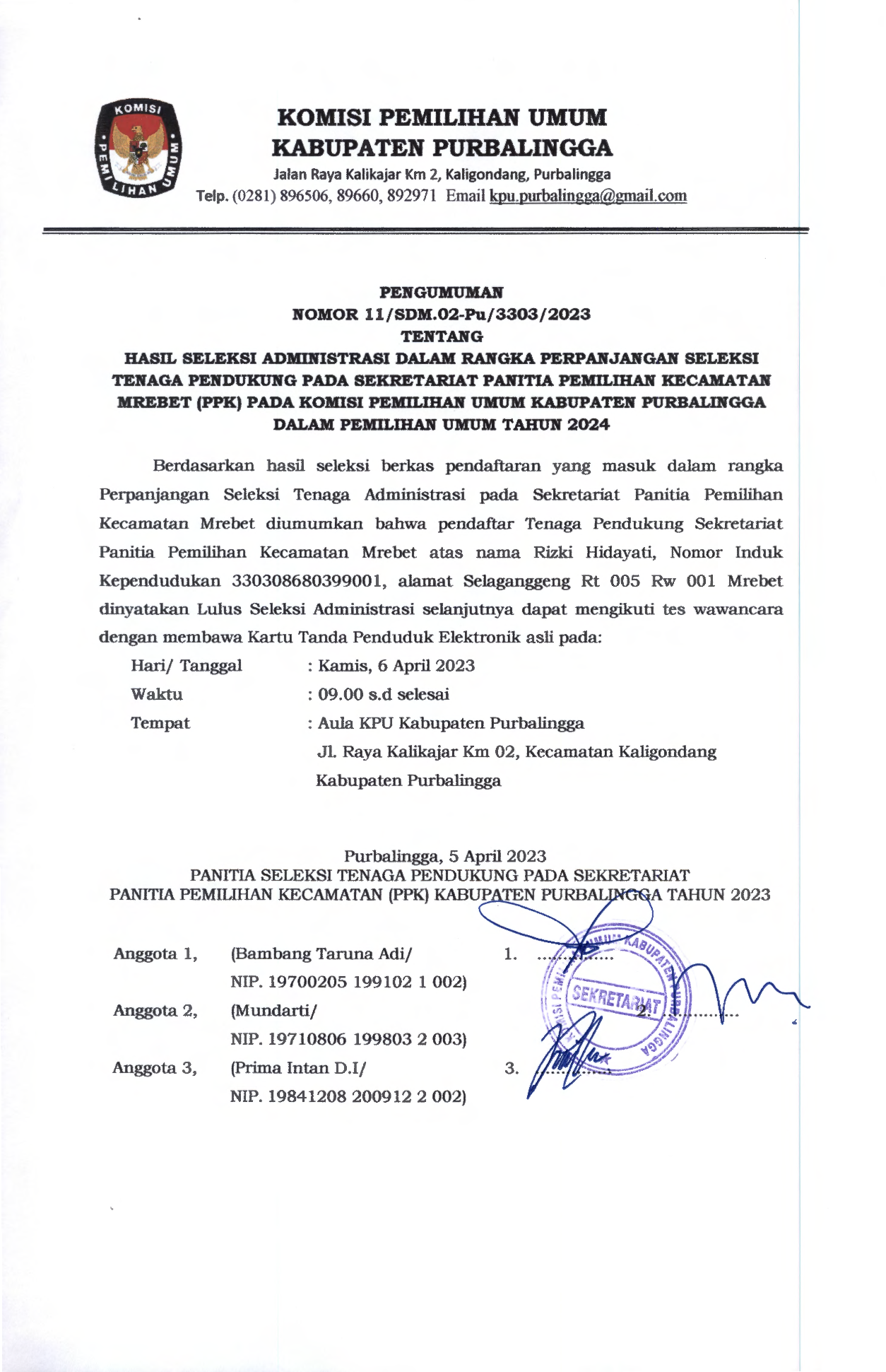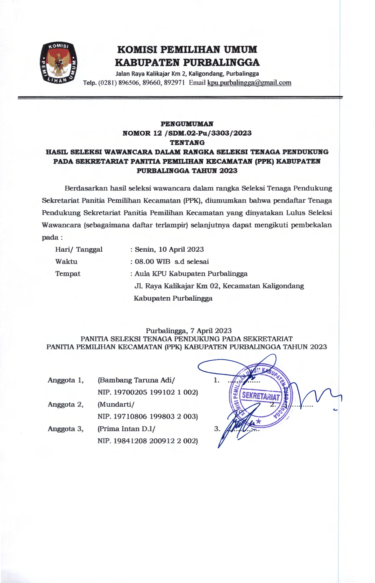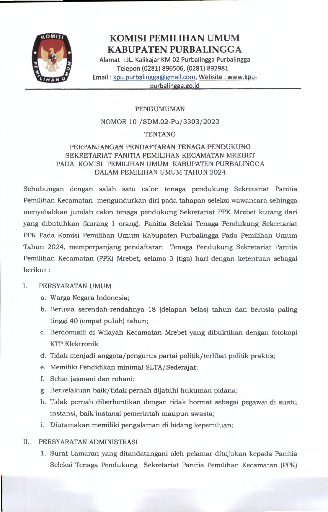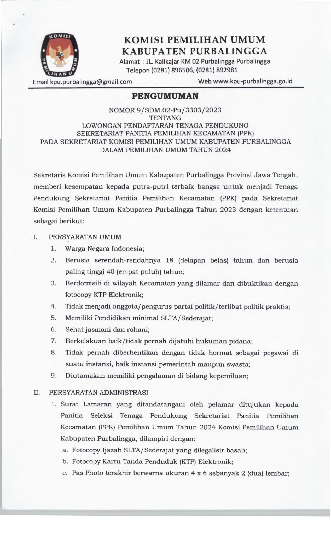 Pengumuman Lowongan Pendaftaran Tenaga Pendukung Sekretariat Panitia Pemilihan Kecamatan (PPK) pada Sekretariat Komisi Pemilihan Umum Kabupaten Purbalingga pada Pemilihan Umum Tahun 2024 dapat diunduh disini.