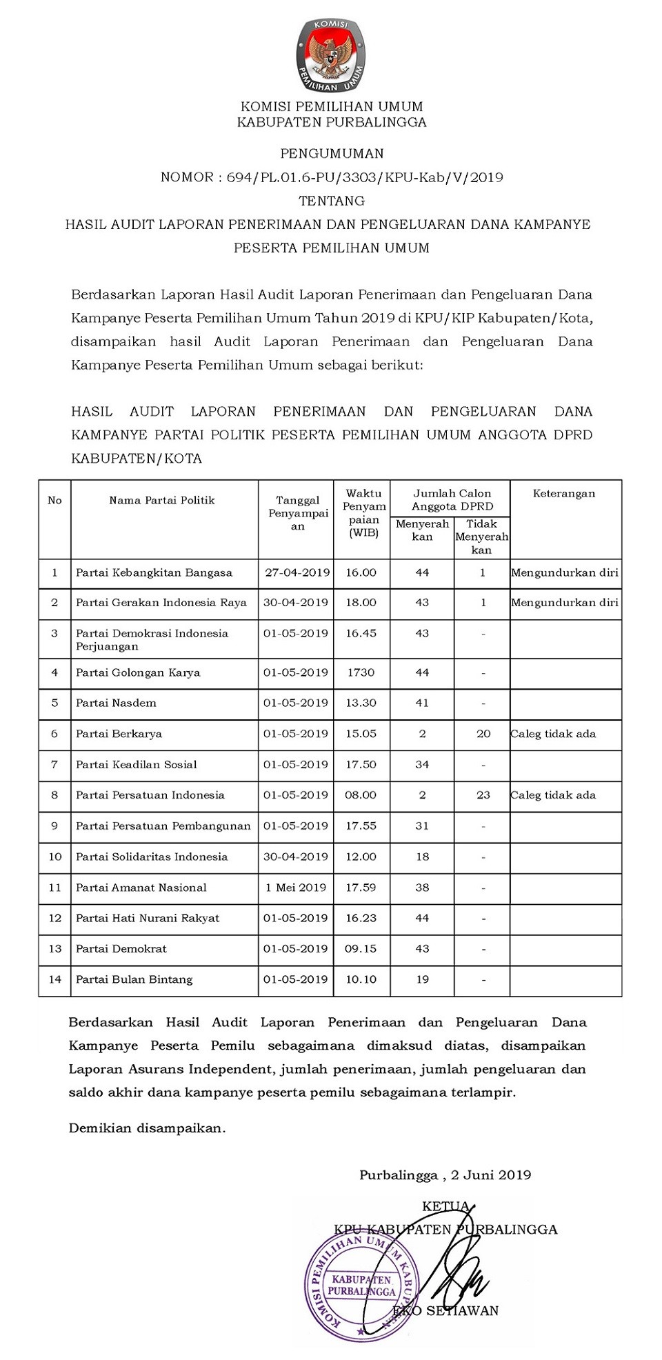 Berdasarkan Hasil Audit Laporan Penerimaan dan Pengeluaran Dana Kampanye Peserta Pemilu sebagaimana dimaksud diatas, disampaikan Laporan Asurans Independent, jumlah penerimaan, jumlah pengeluaran dan saldo akhir dana kampanye peserta pemilu sebagaimana terlampir.