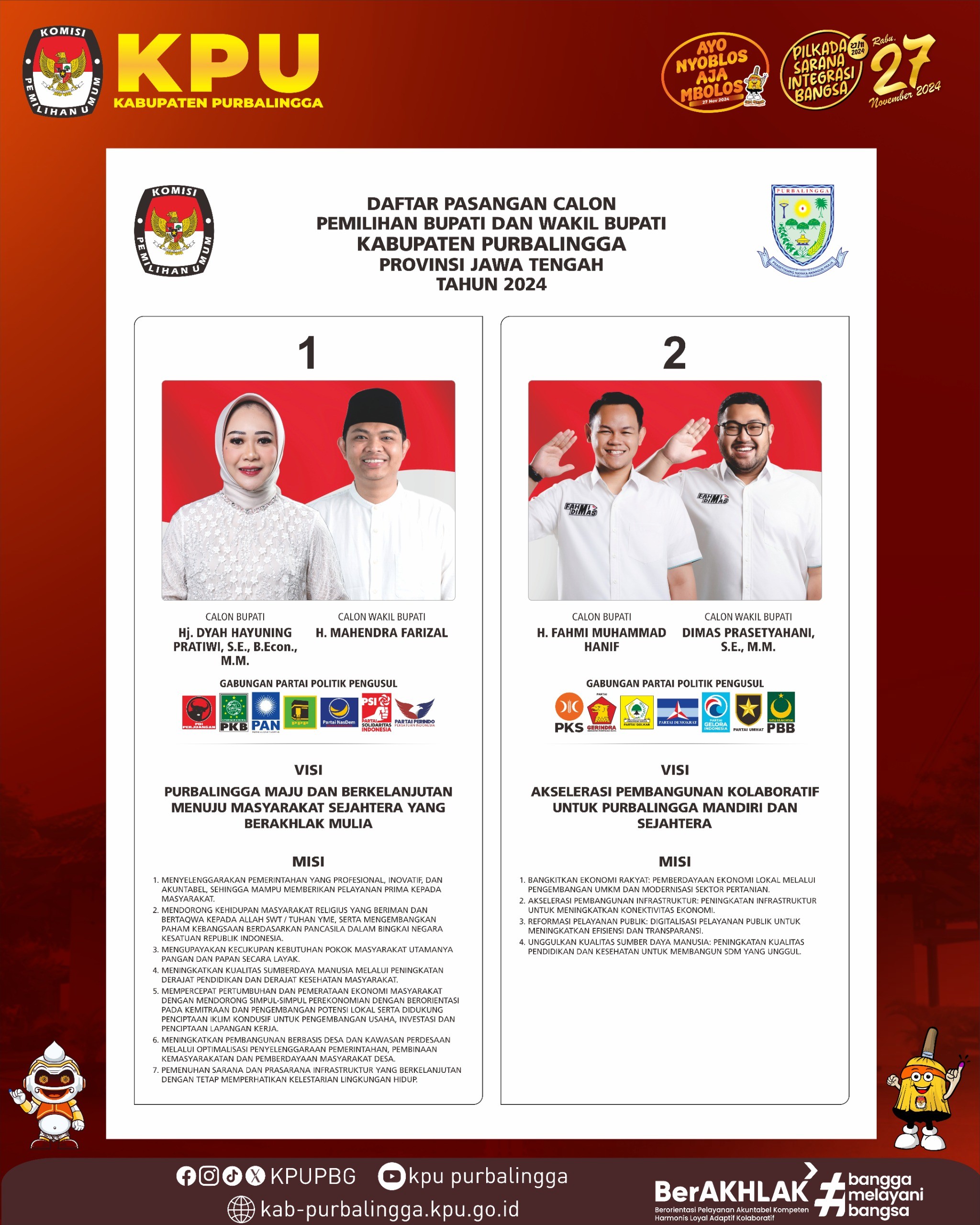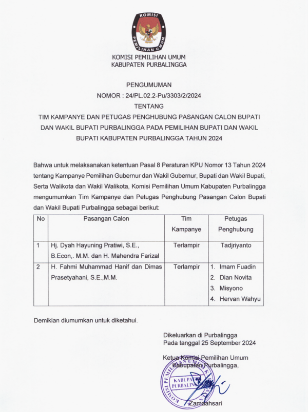 Pengumuman Tim Kampanye dan Petugas Penghubung Pasangan Calon Bupati dan Wakil Bupati Purbalingga pada Pemilihan Bupati dan Wakil Bupati Purbalingga Tahun 2024 dapat diunduh disini