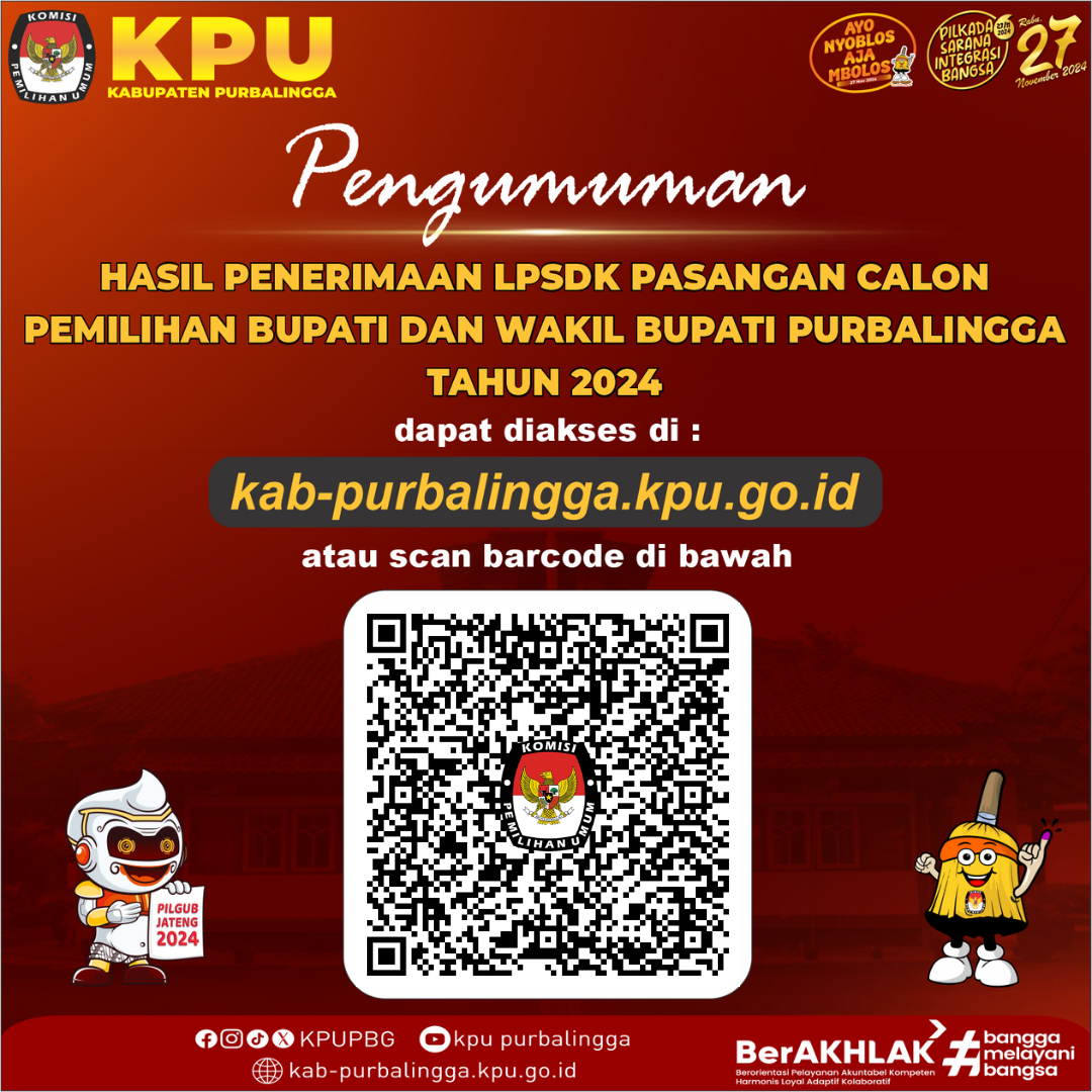 Pengumuman Hasil Penerimaan Laporan Penerimaan Sumbangan Dana Kampanye (LPSDK) Pemilihan Bupati dan Wakil Bupati Purbalingga Tahun 2024 dapat diunduh disini.