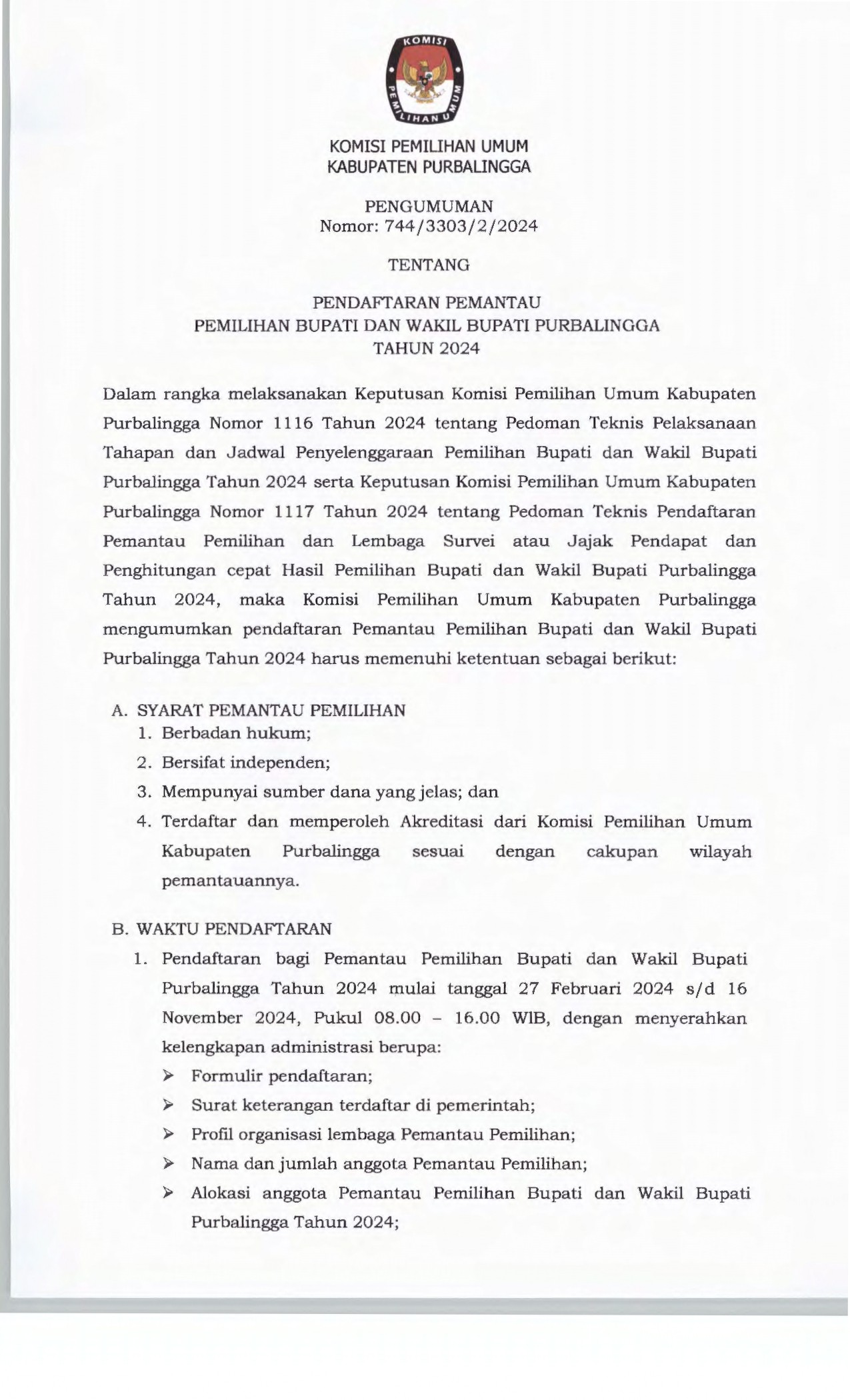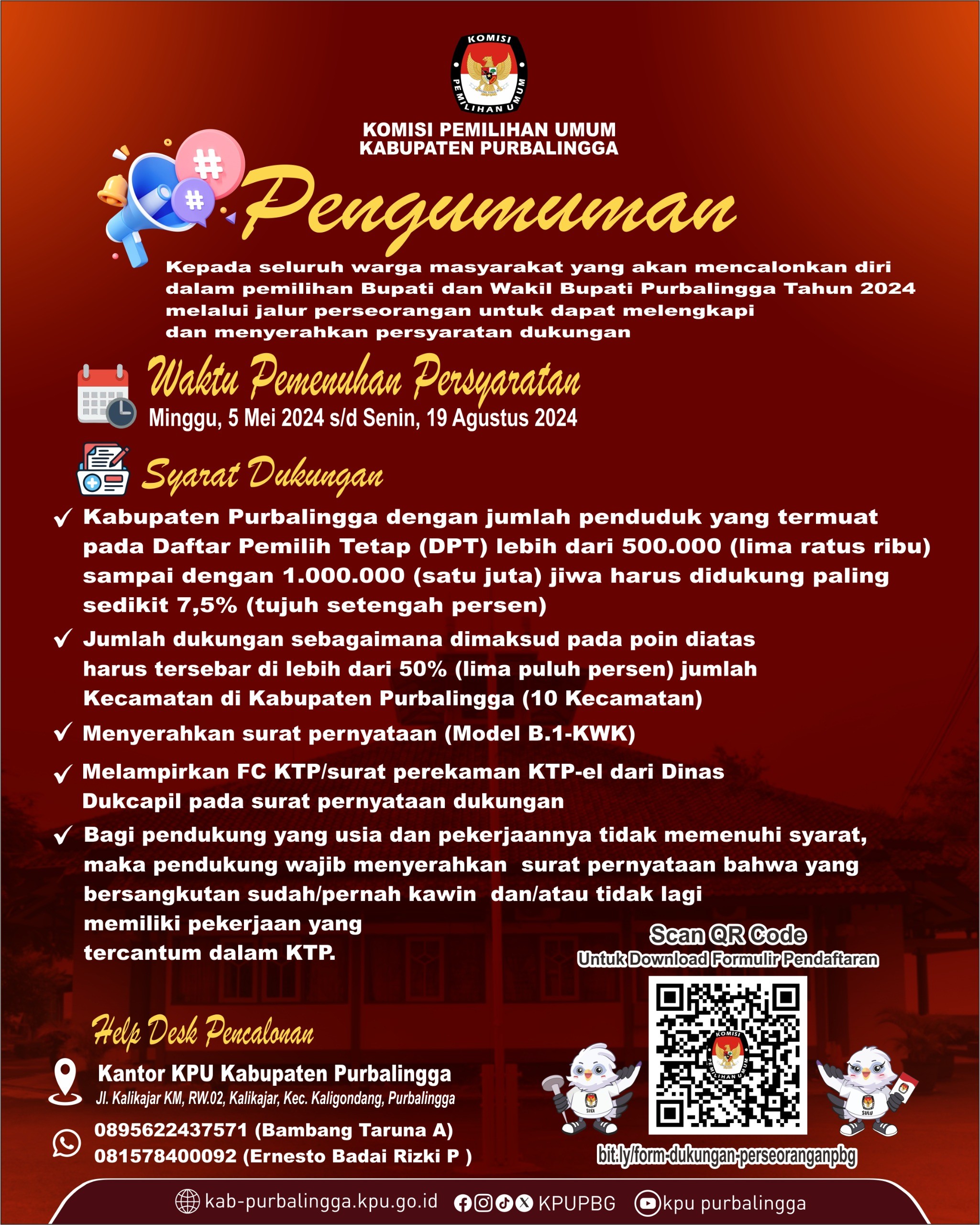 Surat Pernyataan Dukungan Bakal Pasangan Calon Perseorangan dalam Pemilihan Bupati dan Wakil Bupati Purbalingga Tahun 2024 dan Surat Pernyataan Identitas Pendukung Bakal Pasangan Calon Bupati dan Wakil Bupati Purbalingga Tahun 2024 dapat diunduh disini.