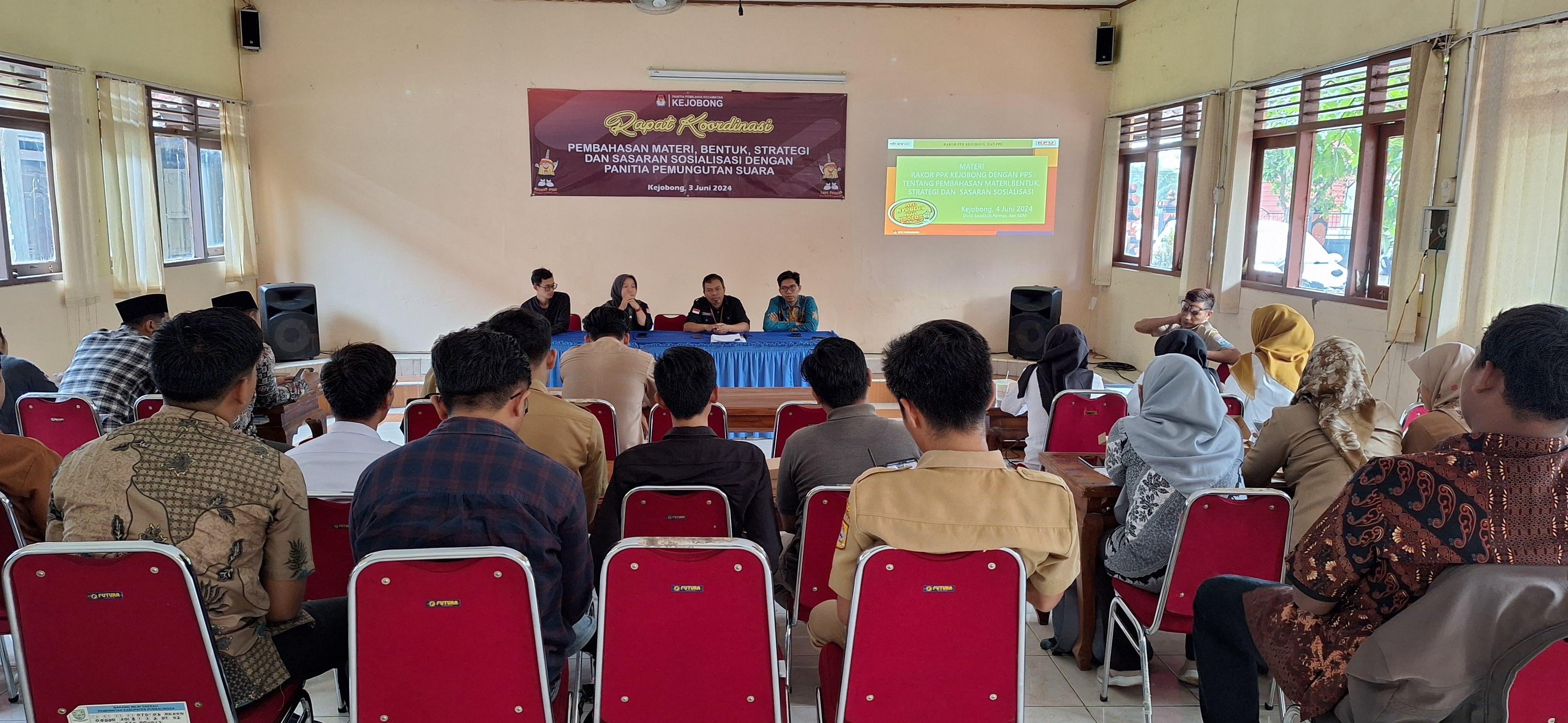 Panitia Pemilihan Kecamatan (PPK) Kejobong melaksanakan Rapat Koordinasi (Rakor) perdana bersama seluruh jajaran PPS pada Senin, 3 Juni 2024. Pelaksanaan rakor guna mengawali tahapan penyelenggaraan Pilkada Serentak 2024 demi terwujudnya Pilkada yang damai, lancar, dan berintegritas. Rakor dengan tema “Pembahasan Materi, Bentuk, Strategi, dan Sasaran Sosialisasi”, tidak lupa dibahas juga perisapan pembentukan Petugas Pemutakhiran Data Pemilih (PPDP) Pemilihan Gubernur Jawa Tengah, dan Bupati Purbalingga 2024. Undangan adalah seluruh PPS Se-Kecamatan Kejobong sejumlah 39 orang dari 13 Desa. Sesuai daftar hadir ada 38 PPS yang hadir dan ada 1 PPS yang ijin tidak bisa hadir dikarenakan sedang ada keperluan ke RS. Acara berlangsung mulai pukul 13.00 s.d 15.30 WIB. Sambutan sekaligus pembukaan secara resmi Rakor dilakukan oleh Ketua PPK Kejobong Bapak Sukandar,S.Sos. Dalam sambutannnya Sukandar menyampaikan “Bahwa Tahapan Pilkada sudah didepan mata, sebentar lagi Tahapan perekrutan PPDP. Sudah menjadi tugas kita untuk selalu bersinergi, satu barisan, satu komando untuk satu tujuan yang sama yaitu suksesnya Pilkada di Kecamatan Kejobong” ujarnya. Acara inti selanjutnya adalah tentang Pembahasan Materi, Bentuk, Strategi, dan Sasaran Sosialisasi yang disampaikan oleh Divisi Sosdiklih, Parmas,dan Sumber Daya Manusia PPK Kejobong , Sri Anita,S.Pd. Dalam paparannya,” Tujuan Sosialisasi adalah untuk mengajak parisipasi masyarakat untuk menjadi pemilih pada Pilkada Serentak 27 November 2024. Memberitahukan kepada Khalayak tahapan-tahapan Pilkada serta memberikan informasi seluas-luasnya dan sebenar-benarnya kepada masyarakat”. Dalam rakor disampaikan juga informasi dari Divisi Data dan Informasi, Saudara Khayat Nur Iman,M.Pd, ”Bahwa sesuai dengan hasil pemetaan sementara Kecamatan Kejobong Pilkada ini rencananya ada 75 TPS di 13 Desa. Data tersebut bisa saja berubah sambil menunggu arahan dari KPU Kabupaten”. Ujarnya