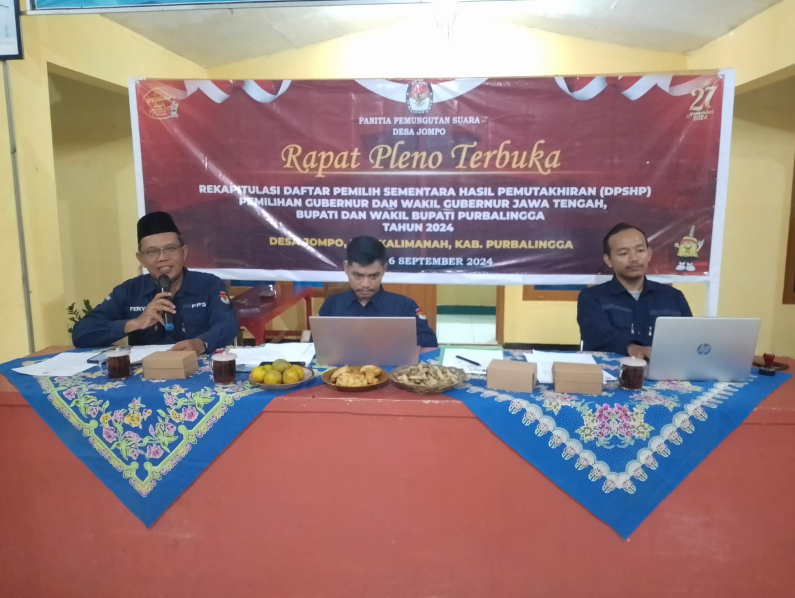 Jompo – Panitia Pemungutan Suara (PPS) Jompo melangsungkan Rapat Pleno Terbuka Rekapitulasi Daftar Pemilih Sementara Hasil Perbaikan (DPSHP) untuk persiapan persiapan pemilihan Gubernur dan Wakil Gubernur Jawa Tengah, Bupati dan Wakil Bupati Purbalingga tahun 2024 desa Jompo pada Jum’at, (06/09/2024). Rapat Pleno Terbuka Rekapitulasi Daftar Pemilih Sementara Hasil Perbaikan (DPSHP) Pilkada 2024 dihadiri oleh sejumlah elemen diantaranya yaitu : PPS Desa Jompo, Sekretariat PPS Desa Jompo, PKD Desa Jompo, Forkompimdes, Tim pemenangan pasangan calon dan perwakilan partai politik dari yang ada di desa Jompo. Rapat dibuka oleh Ketua PPS Jompo Pak Feri Putra Setiawan. Sesuai PKPU No 8 Tahun 2022 Tentang Pembentukan dan Tata Kerja Badan Adhoc Bagian Keempat Mekanisme Pengambilan Keputusan Panitia Pemungutan Suara Pasal 24 Ayat 1 "Rapat Pleno PPS sebagaimana dimaksud dalam Pasal 23 ayat (1) dinyatakan sah jika dihindari oleh paling sedikit 2/3 dari jumlah anggota PPS yg dibuktikan dengan daftar hadir. ” Rapat Pleno Terbuka Rekapitulasi DPSHP Desa Jompo sudah kuorum dengan ketiga PPS Jompo hadir semua. Dengan mengucapkan Bismillahirrahmanirrahim Rapat Pleno Rekapitulasi DPSHP Desa Jompo dibuka!”. tegas Pak Feri Kronologi terbentuknya DPSHP dijelaskan oleh divisi Data dan Informasi PPS Jompo Ikhsan Khoerul Habib. ” Jadi saya ingatkan kembali dalam proses terbentuknya DPT itu ada 6 tahapan, dimulai dari D4, DPHP, DPS, DPSHP, DPSHP Akhir dan terakhir menjadi DPT. Rangkaiannya yang panjang merupakan amanat dari konstitusi agar dilakukan hati-hati untuk meminimalisir kesalahan yang akan terjadi sehingga seorang warga negara tidak kehilangan hak pilihnya”. Kata Habib Dalam DPSHP kali ini ada TMS sebanyak 7 orang terdiri dari : TPS 001 ada 1 orang, TPS 002 ada 5 orang, dan TPS 003 ada 1 orang. Kemudian ada data masuk sebanyak 4 orang terdiri dari : TPS 001 ada 3 orang, TPS 002 ada 1 orang, dan TPS 003 nihil. Sehingga total DPSHP di desa Jompo sebanyak 1681 orang. ”Sampai detik ini, dari laporan dan tanggapan masyarakat DPSHP di desa Jompo berjumlah 1681 orang pemilih”. tambah Pak Feri