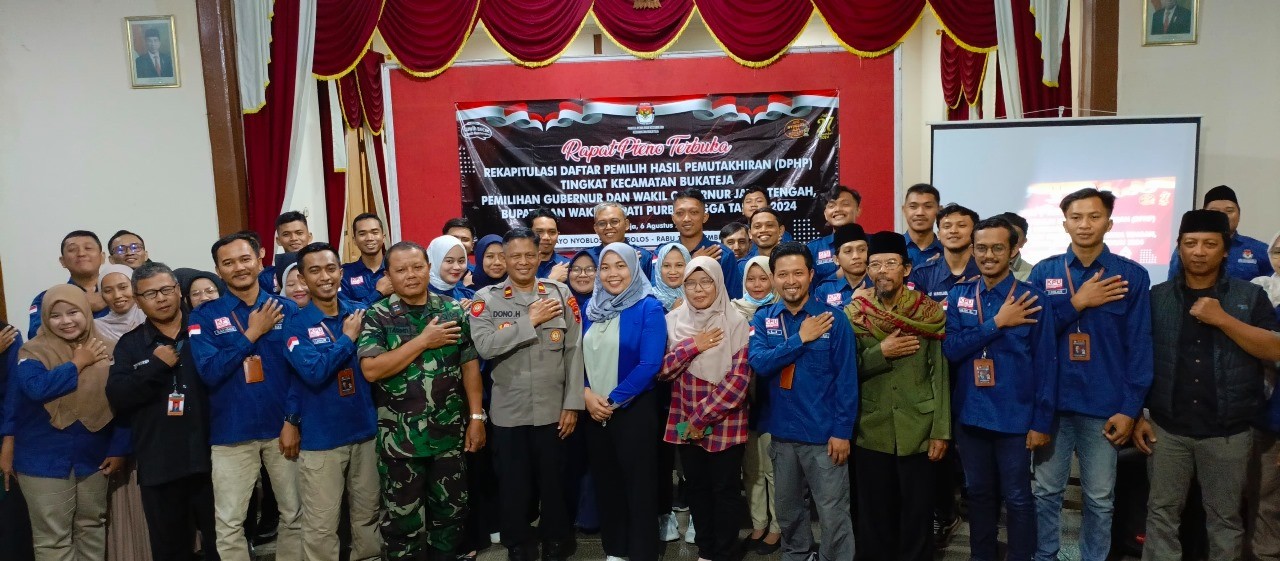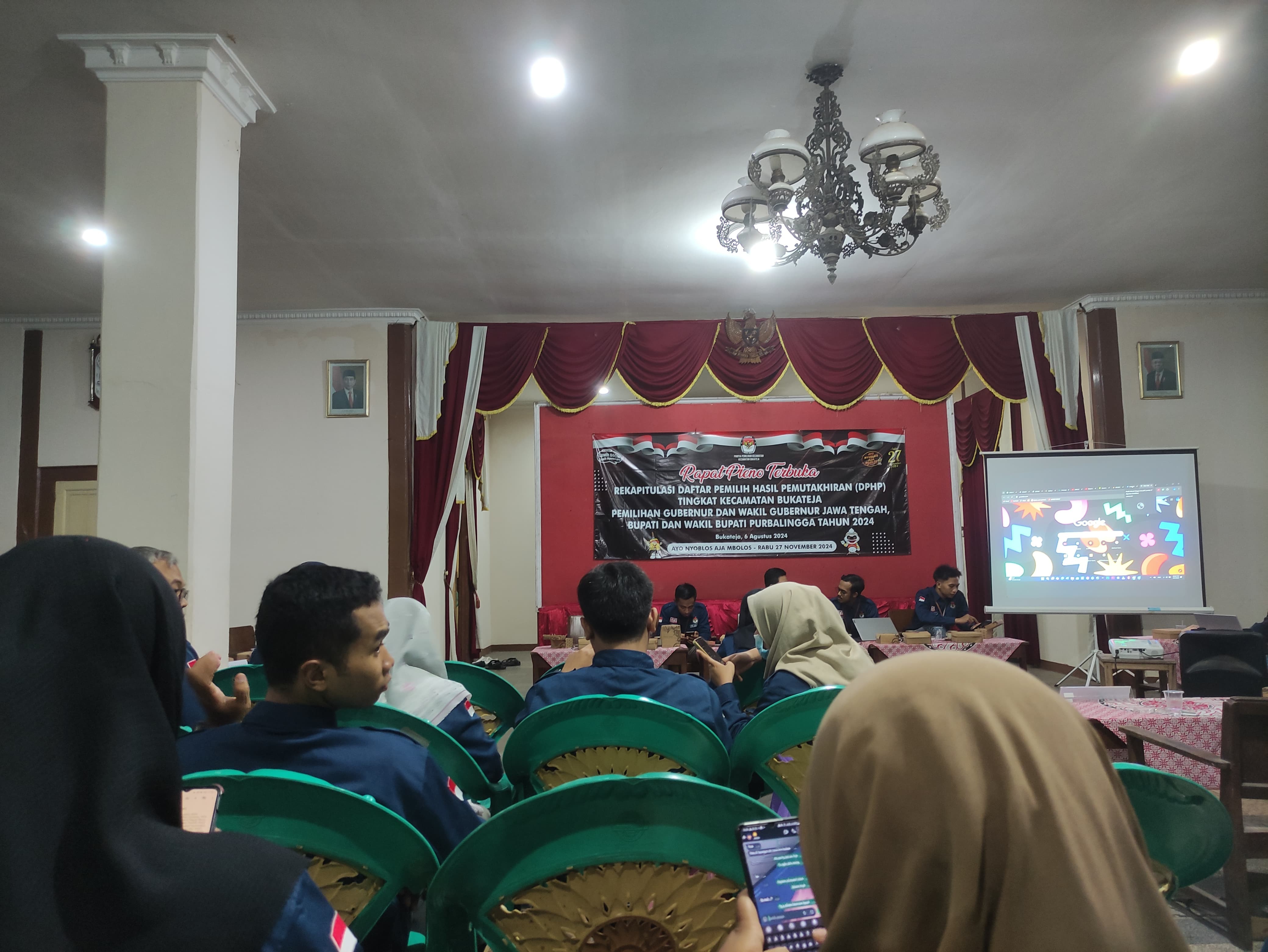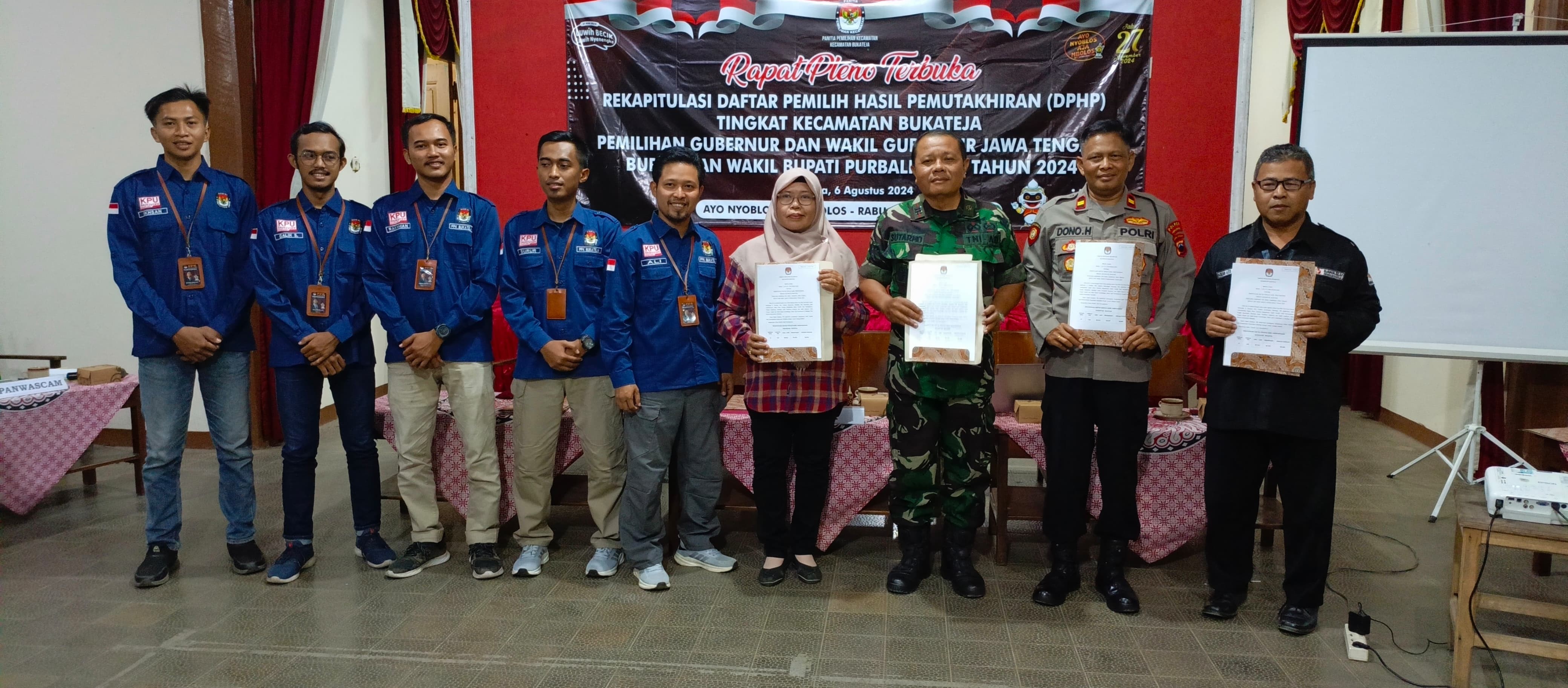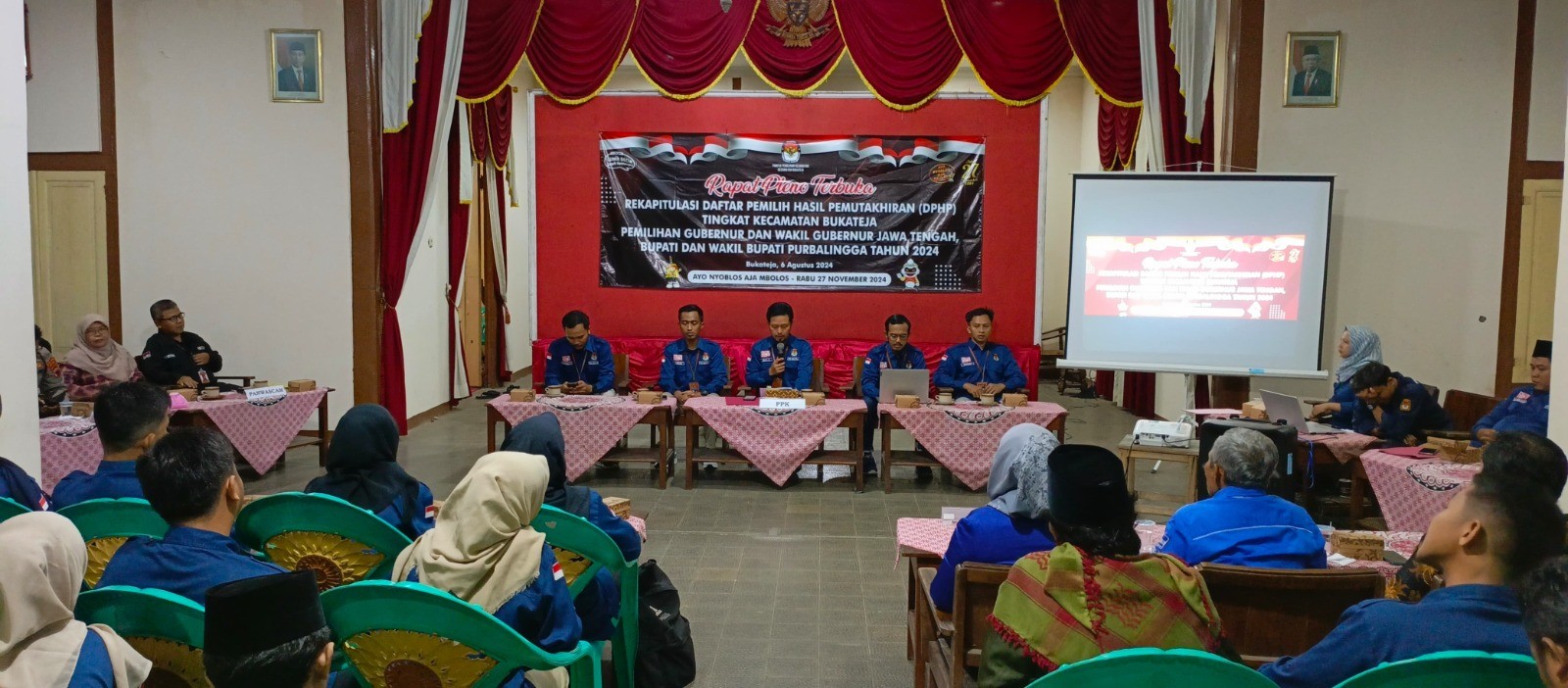 PPS Desa Penaruban mengikuti Rapat Pleno Terbuka Rekapitulasi Daftar Pemilih Hasil Pemutakhiran (DPHP) Tingkat Kecamatan Bukateja yang diselenggarakan di Pendopo Wiro Hutomo Kecamatan Bukateja pada hari Selasa, 6 Agustus 2024. Rapat Pleno dihadiri oleh PPK dan sekretariat Kecamatan Bukateja, PPS se-kecamatan Bukateja, Perwakilan Parpol, Panwaslu Kecamatan, Kapolsek dan Danramil Bukateja. Acara dimulai dengan sambutan oleh Camat Bukateja yang diwakili oleh Ibu Sri Pangestuti selaku Kasie Keuangan Kecamatan Bukateja, sambutan dari Kapolsek dan Danramil yang dalam sambutannya menyampaikan agar kegiatan ini dapat mempererat koordinasi dengan pihak-pihak yang terkait dengan pelaksanaan Pilkada, memastikan data akurat, mengikuti tahapan-tahapan Pilkada sesuai aturan, pelaksanaan Pilkada nantinya berjalan dengan tertib sehingga masyarakat merasa senang dengan adanya pesta demokrasi. Selanjutnya, kegiatan rapat pleno dibuka oleh Aliy Wakhyu Hidayat selaku Ketua PPK Bukateja. Perwakilan PPS dari 14 desa di Kecamatan Bukateja membacakan hasil rekapitulasi daftar pemilih hasil pemutakhiran di masing-masing desa, dilanjutkan dengan usulan dan Masukan dari peserta yang hadir dalam rapat pleno. Hasil rekapitulasi ditingkat kecamatan bukateja terdiri dari 14 desa, 118 TPS, data pemilih laki-laki 30.511, pemilih perempuan 30.293 dengan total pemilih 60.804 hal ini tertuang dalam Berita Acara (BA) yang selanjutnya ditanda tangani oleh ketua PPK dan anggotanya lalu salinan BA dibagikan kepada pihak terkait. Rapat pleno berjalan dengan lancar dan ditutup dengan foto bersama.