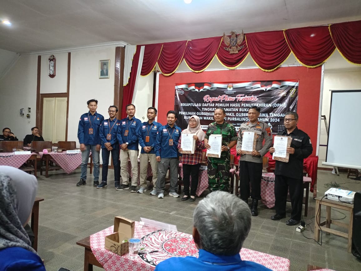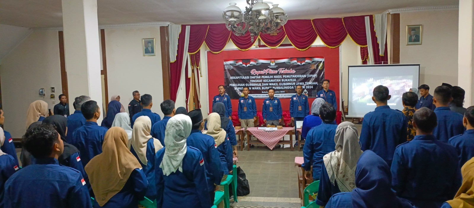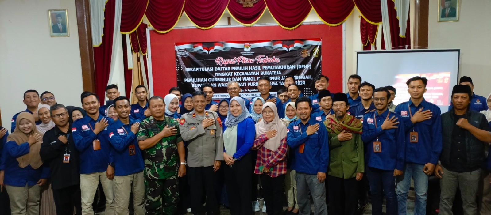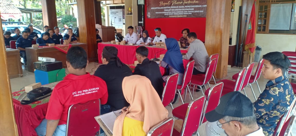 Bukateja. Selasa (06/08/2024) PPS Desa Karangcengis mengikuti Rapat Pleno Terbuka Rekapitulasi Daftar Pemilih Hasil Pemutakhiran (DPHP) Tingkat Kecamatan Bukateja yang diselenggarakan di Pendopo Wiro Hutomo Kecamatan Bukateja Ibu Sri Pangestuti selaku Kasie Keuangan Kecamatan Bukateja menyampaikan rapat pleno ini sebagai sarana mempererat koordinasi dengan pihak-pihak terkait, memastikan datanya akurat mengingat tahapan ini merupakan tahapan yang krusial . Tutur Sri Pangestuti Kapolsek Bukateja Iptu Dono Hendarto dalam sambutannya menyampaikan Jangan memberikan kebijaksanaan yang tidak sesuai dengan aturan yang berlaku, ikuti setiap tahapan dan saling berkoordinasi terus dengan PPK. Kapten Sutarmo dari Danramil Bukateja menyampaikan dalam sambutannya setiap warga negara yang punya hak pilih harus terdata, pelaksanaan pilkada harus berjalan dengan tertib, aman dan lancar seperti Pemilu serentak yang lalu. Dari pihaknya siap mengawal pelaksanaan Pilkada, jangan sungkan-sungkan untuk selalu berkoordinasi. Pembacaan hasil pleno di tingkat PPS yang disampaikan oleh 14 PPS setelah adanya sinkronisasi di tingkat nasional. Aliy Wakhyu Hidayat selaku ketua PPK Bukateja menyampaikan hasil rekapitulasi ditingkat Kecamatan Bukateja untuk pemilihan Gubernur dan Wakil Gubernur Jawa Tengah, Bupati dan Wakil Bupati Purbalingga Tahun 2024 yang terdiri dari 14 Desa, 118 TPS,Data Pemilih Laki-laki 30.511, Pemilih Perempuan 30.293 dengan total pemilih 60.804. Penandatanganan berita acara oleh PPK Bukateja, selanjutnya menyampaikan salinan asli berita acara tersebut kepada pihak terkait. (Wahyu Adi W)