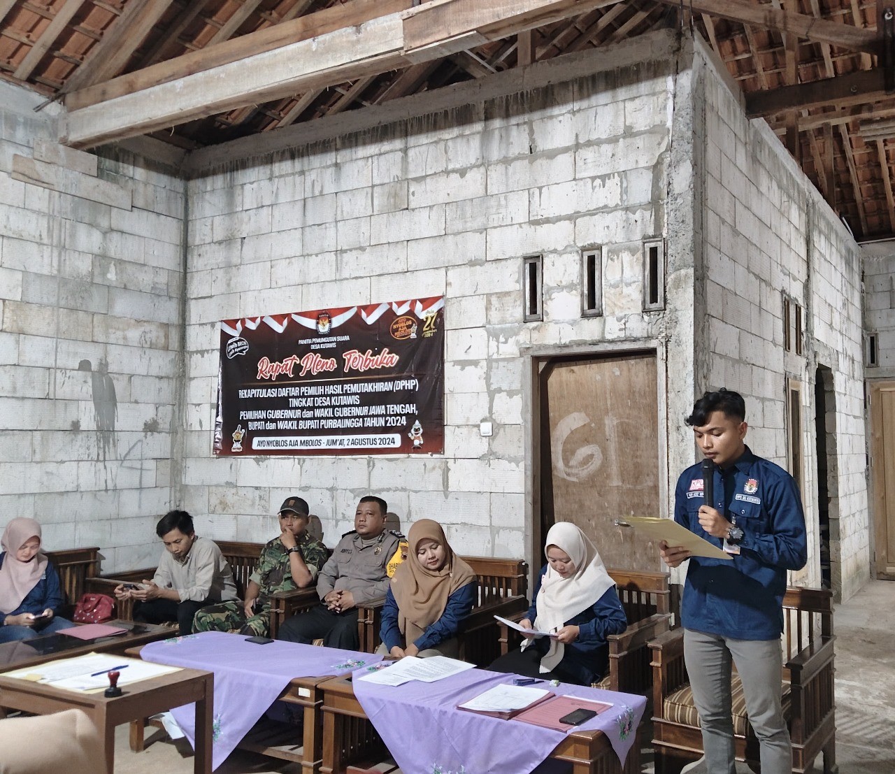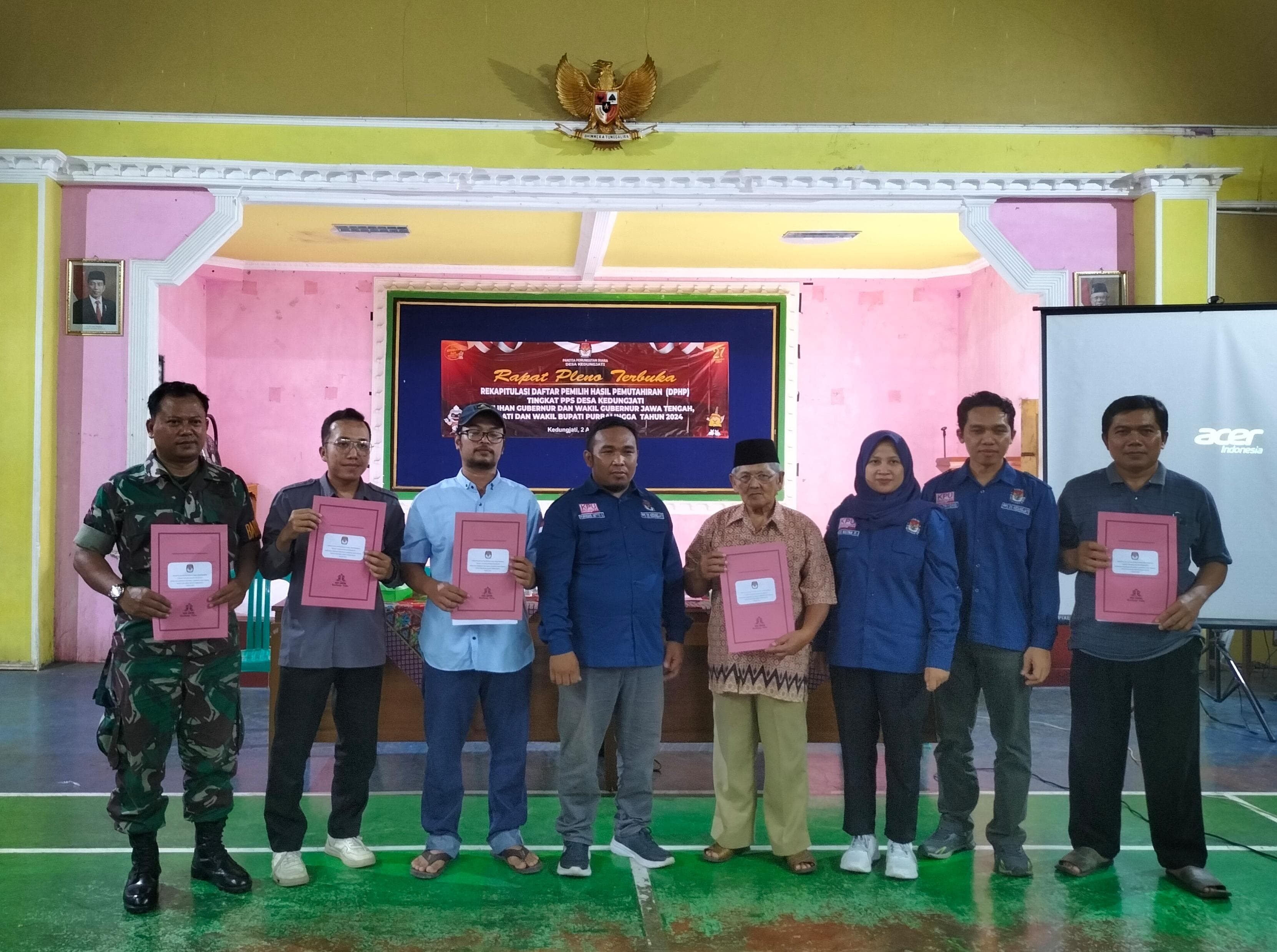 Bukateja – Kedungjati, Jumat (2/8/2024) Berdasarkan Peraturan KPU Nomor 7 Tahun 2024 tentang Penyusunan Daftar Pemilih Dalam Penyelenggaraan Pemilihan Gubernur dan Wakil Gubernur, Bupati dan Wakil Bupati tentang pedoman teknis penyusunan daftar pemilih dalam negeri pada penyelenggaraan pemilihan Kepala Daerah, PPD Desa Kedungjati menyelenggarakan Rapat Pleno Terbuka Rekapitulasi Daftar Pemilih Hasil Pemutakhiran (DPHP) Tingkat Desa pada Pemilihan Kepala Daerah 2024. Rapat Pleno Terbuka diselenggarakan di Aula Balai Desa Kedungjati pada Jum’at 2 Agustus 2024 pukul 14.00 sampai dengan selesai. Rapat Pleno ini terbuka untuk umum dimana tercatat yang hadir dalam Rapat Pleno Terbuka ini antara lain Kepala Desa Kedungjati, Ketua PPS Desa Kedungjati (Purnomo Setyo Utomo) beserta anggotanya (Aris Triono dan Dyah Ratna P.), Sekretariat PPS Desa Kedungjati, Pantarlih Desa Kedungjati, Panwasdes Bhabinkamtibnas, Babinsa, ketua partai politik, serta tokoh masyarakat Desa Kedungjati. Hasil DPHP dan Berita acara selanjutnya akan diserahkan kepada PPK Kecamatan Bukateja dan KPU Kabupaten Purbalingga. Menyambung Rapat Pleno ditingkat Desa, PPK Kecamatan Bukateja juga akan menyelenggarakan Rapat Pleno Terbuka Tingkat Kecamatan.