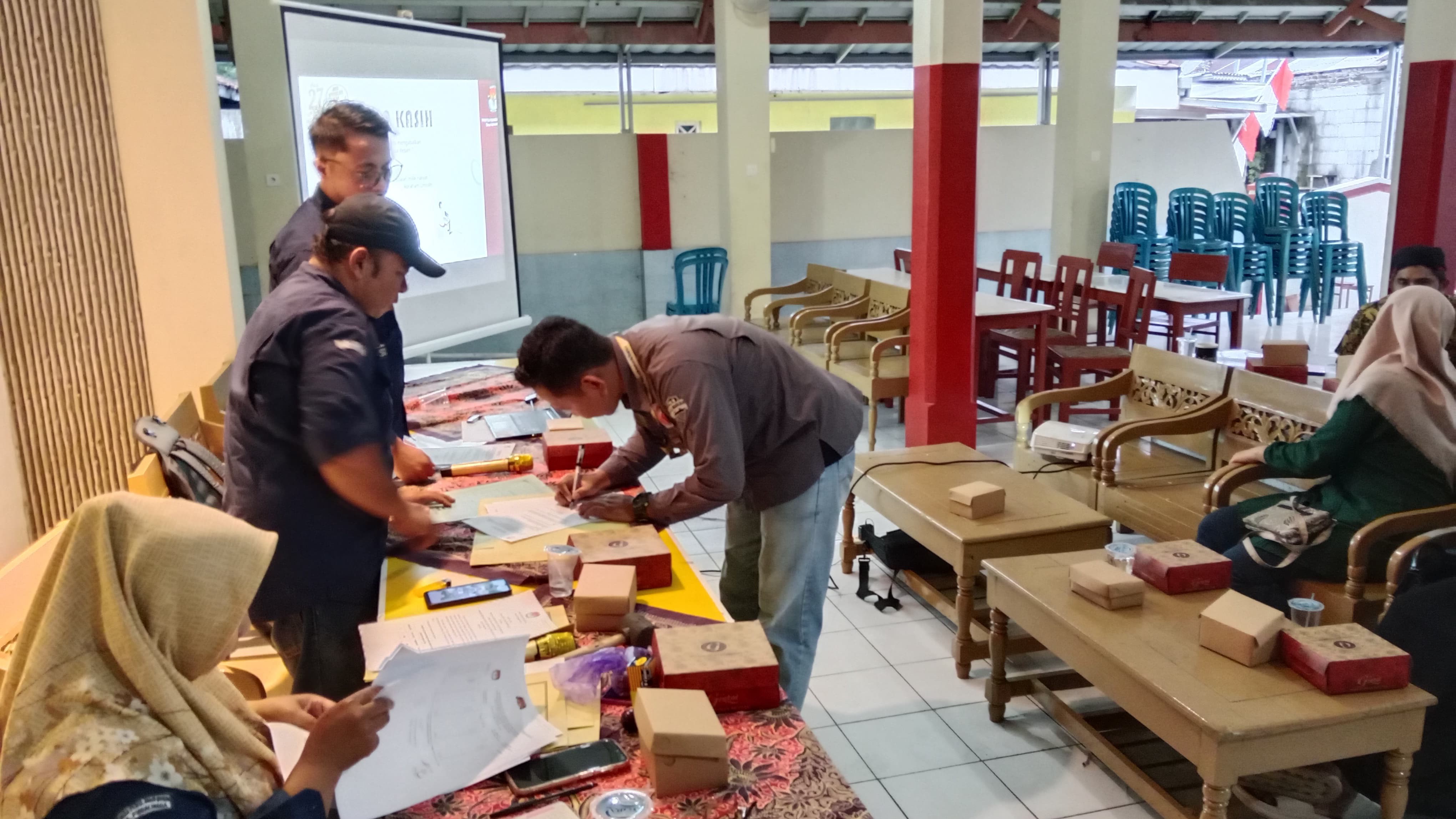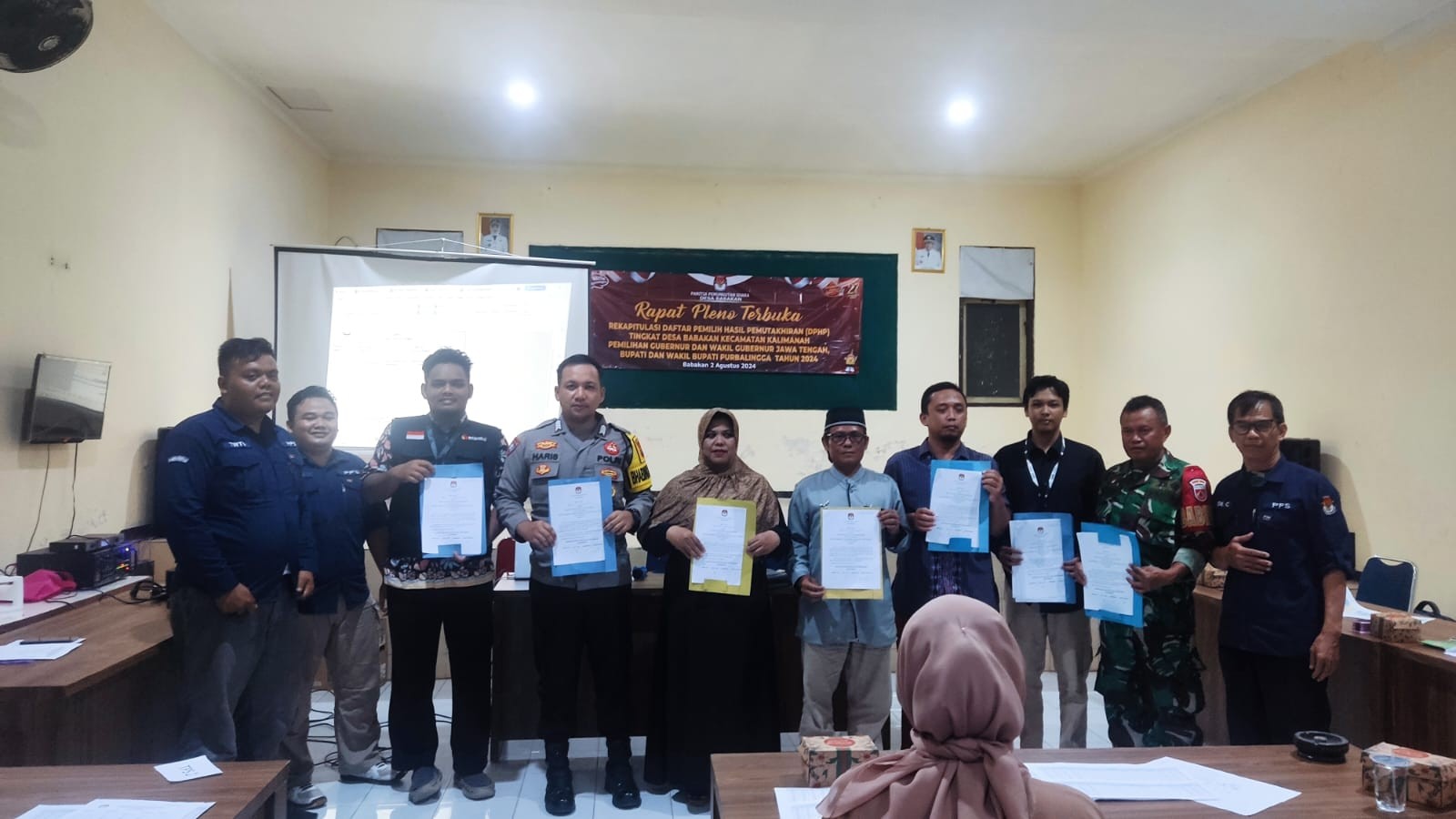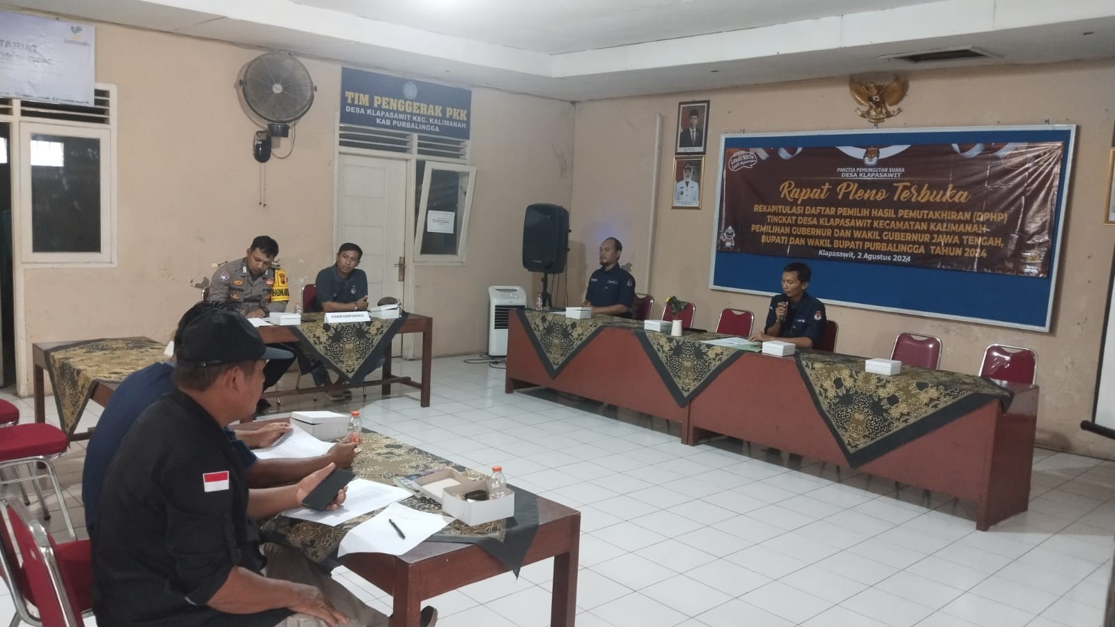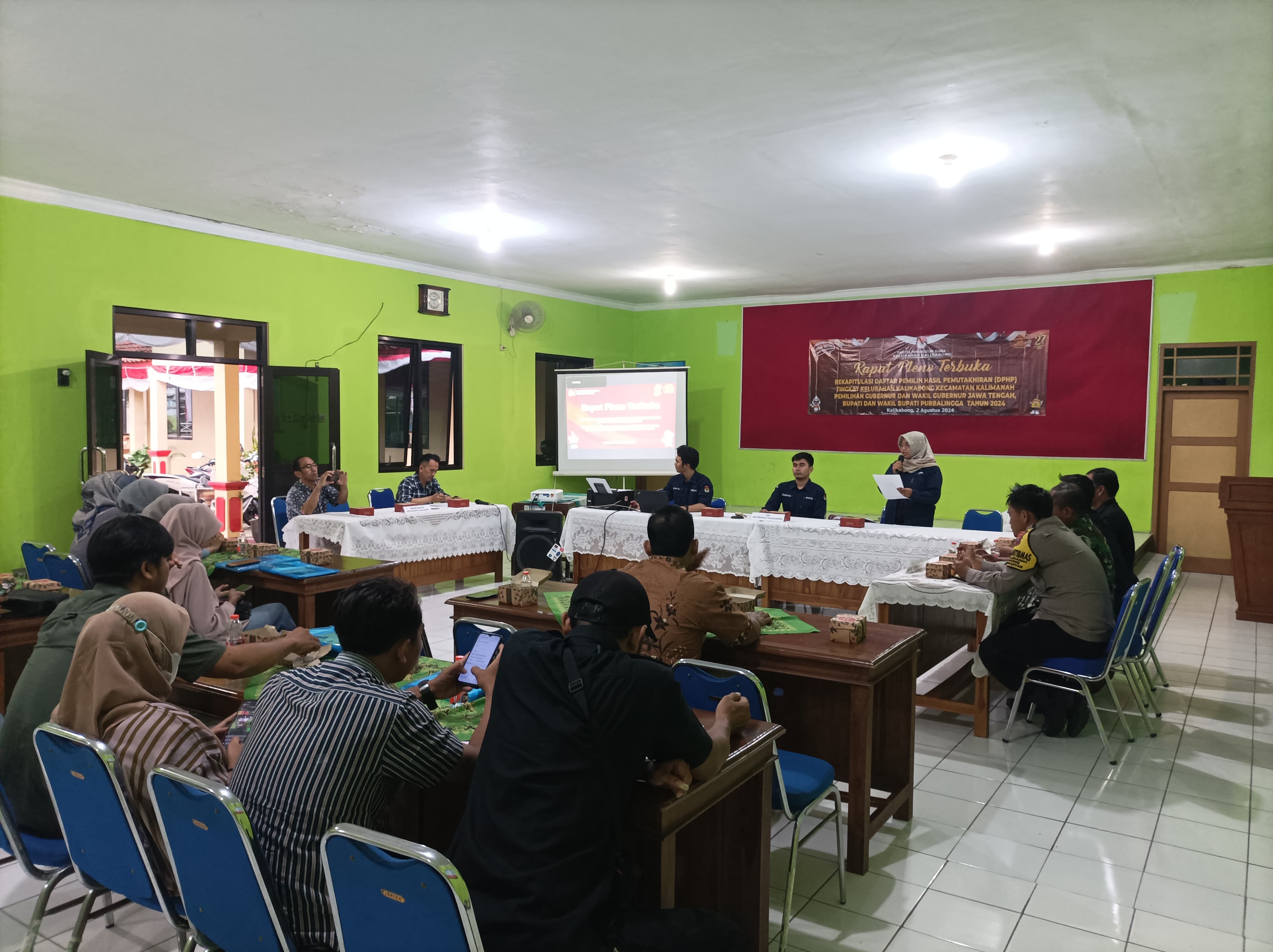 KALIKABONG - “Tok..tok..tok”, ditandai dengan ketukan palu oleh Ketua PPS Kelurahan Kalikabong menandai dibukanya Rapat Pleno Terbuka Daftar Pemilih Hasil Pemutakhiran (DPHP) untuk Pemilihan Gubernur dan Wakil Gubernur Jawa Tengah, Bupati dan Wakil Bupati Purbalingga Tahun 2024 tingkat Kelurahan Kalikabong. Rapat pleno dimulai pukul 16.30 WIB dengan dihadiri oleh Sekretaris Kelurahan Kalikabong, Forkompimdes Kalikabong (Babinsa, Babinkamtibmas), Panwas Kalikabong, perwakilan Partai Politik dari Gerindra, PKS, Golkar dan PKB, serta petugas Pantarlih Pilkada 2024 Kelurahan Kalikabong.