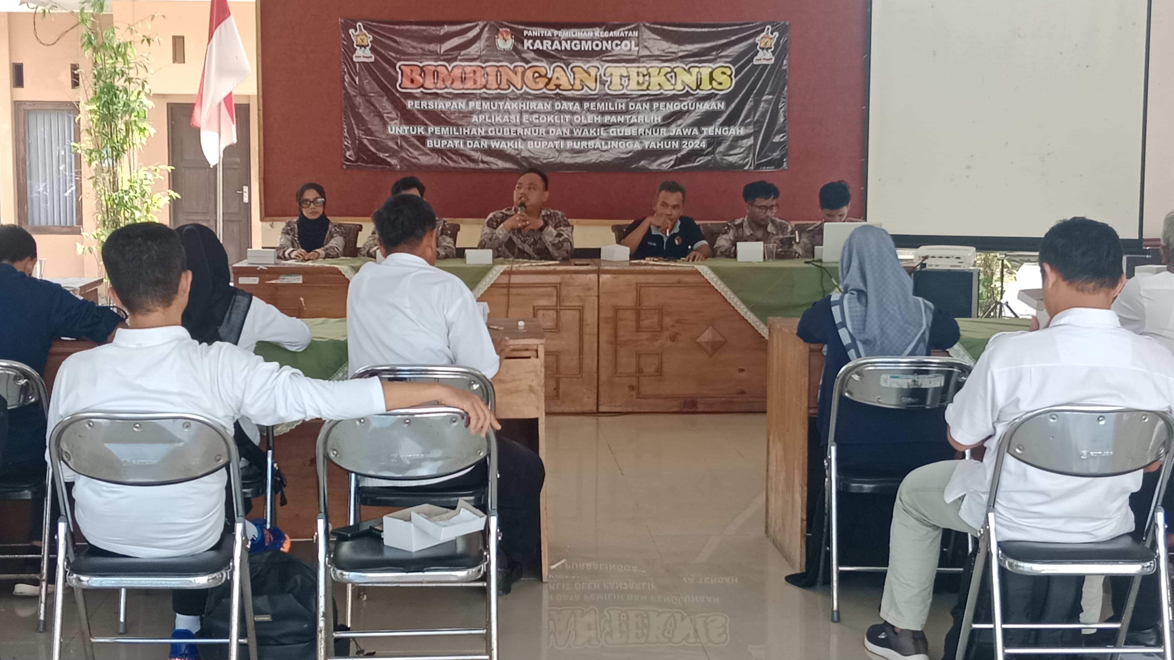 Karangmoncol – Rabu, 19 Juni 2024 Panitia Pemilihan Kecamatan (PPK) Karangmoncol melaksanakan Bimbingan Teknis Persiapan Pemutakhiran Data Pemilih dan Penggunaan Aplikasi E-Coklit oleh Pantarlih untuk Pemilihan Gubernur dan Wakil Gubernur Jawa Tengah Bupati dan Wakil Bupati Kabupaten Purbalingga. Kegiatan ini dilaksanakan di Aula Pendopo Kecamatan Karangmoncol. Kegiatan Bimtek ini di buka oleh Ketua PPK Iwan Supriyatno, ysng mengatakan “sistem seleksi penerimaan Pantarlih untuk terbuka. Calon Pantarlih diharapkan memiliki etos kerja yg tinggi dan diharapkan memilili pengalaman. Selain itu Iwan juga menyampaikan bahwa suksesnya Pilkada tahun ini merupakan kerja sama tim”. Ketua Pengawas Pemilu Kecamatan Soleh Ibrohim juga hadir dalam kegiatan ini. “Kami dari pengawas pusat maupun desa ada beberapa harapan untuk teman teman yang nantinya akan jadi Pantarlih. Harapan kami yang pertama dalam proses seleksi, calon anggota Pantarlih dipastikan tidak masuk sipol. Yang kedua calon anggota Pantarlih dipastikan dia bukan simpatisan partai. Dan diharapkan ketika ada masalah bisa dikordinasikan dan di komunikasikan dengan sesama penyelenggara. Aturan sudah dibuat mari kita ikuti aturannya dan yang terakhir sesama penyelenggara pemilu harus saling bekerja sama.” Kegiatan selanjutnya pembahasan terkait materi Bimbingan Teknis dan tutorial aplikasi e coklit. Materi ini disampaikan oleh Divisi Data Dan Informasi Afton Zuhdi. Setelah itu dilanjutkan diskusi dan tanya jawab.